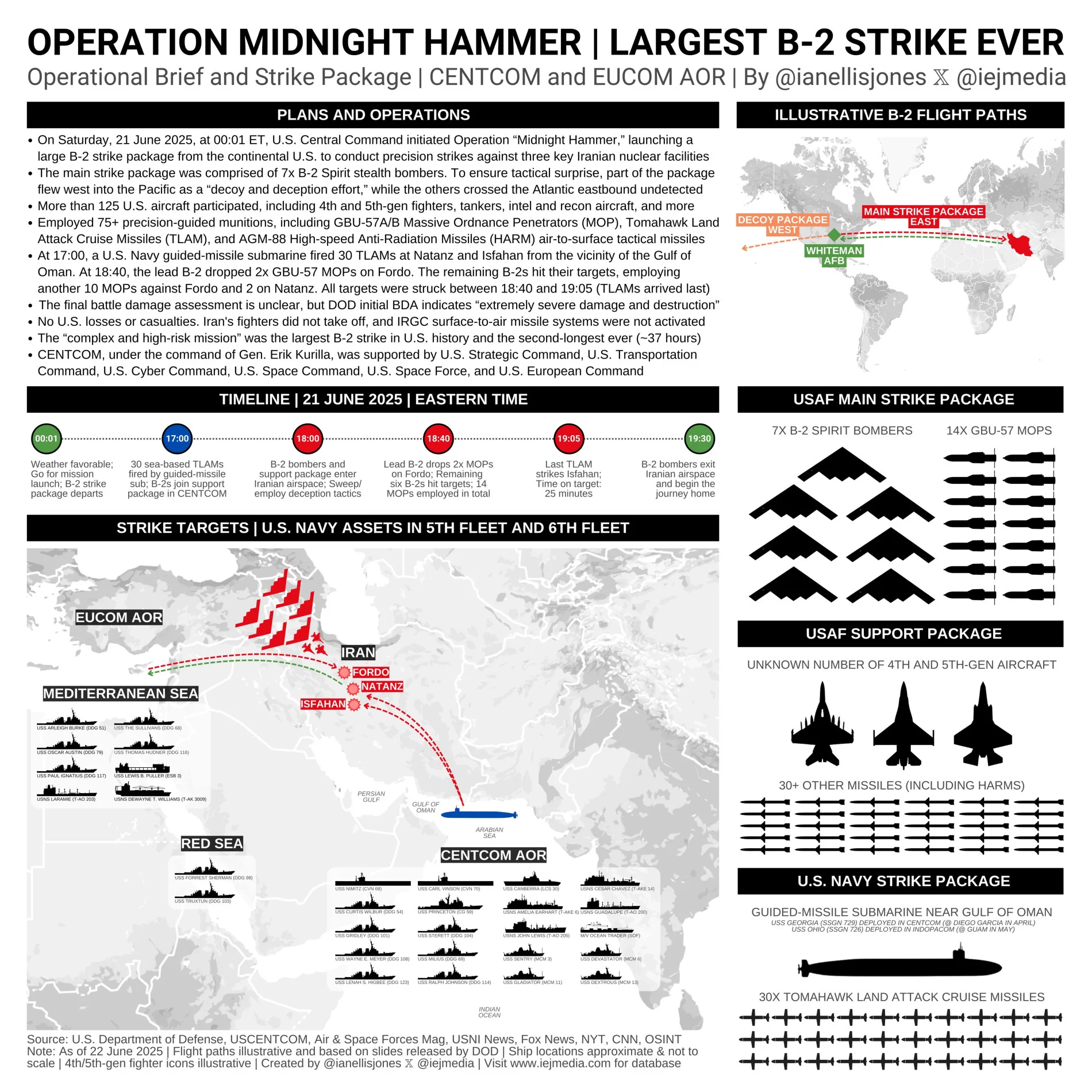 Με αυτόν τον τρόπο, το Πεντάγωνο των ΗΠΑ κλιμάκωσε το τελεσίγραφο προς το Ιράν, διατηρώντας, ωστόσο, το προνόμιο του αιφνιδιασμού, καθώς μέρος του στόλου των βομβαρδιστικών δεν είχε αποκαλυφθεί μέχρι την έναρξη της στρατιωτικής επιχείρησης, υποστηριζόμενος και από τη δυνατότητα των Β-2 να παραμένουν «αόρατα »από τα ραντάρ ως stealth.