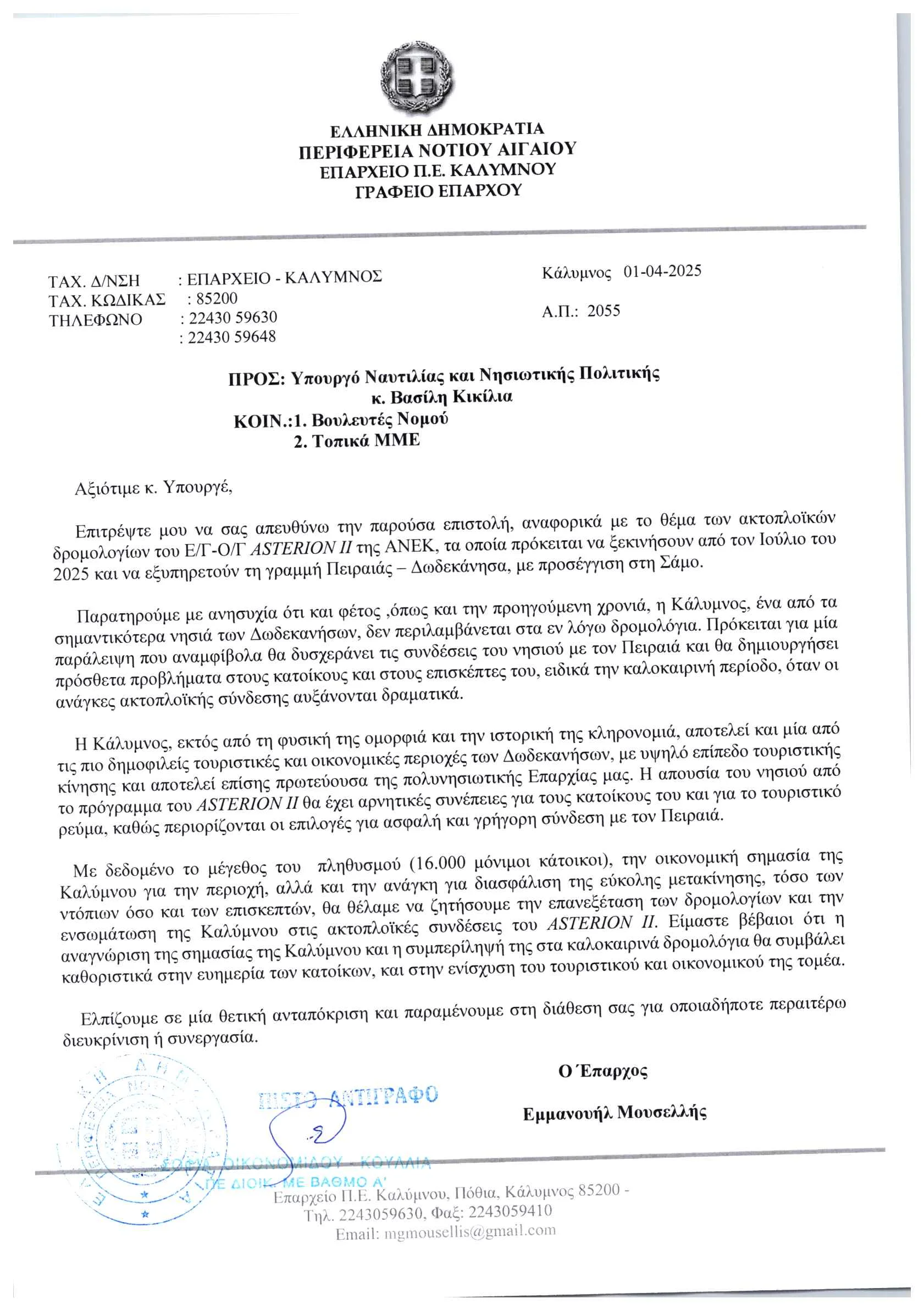 Επιτρέψτε μου να σας απευθύνω την παρούσα επιστολή, αναφορικά με το θέμα των ακτοπλοϊκών δρομολογίων του Ε/Γ-Ο/Γ ASTERION II της ANEK, τα οποία πρόκειται να ξεκινήσουν από τον Ιούλιο του 2025 και να εξυπηρετούν τη γραμμή Πειραιάς – Δωδεκάνησα, με προσέγγιση στη Σάμο.