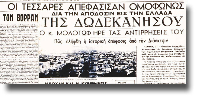 27 Ιουνίου 1946: Στο Παρίσι και στο Συμβούλιο των Υπουργών των Εξωτερικών των τεσσάρων Δυνάμεων, αποφασίζεται να περιέλθουν τα Δωδεκάνησα στην Ελλάδα. Πρόκειται για απόφαση-σταθμό στην πορεία του δωδεκανησιακού λαού προς την ένωσή του με τη μητέρα Ελλάδα.