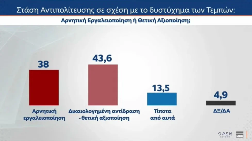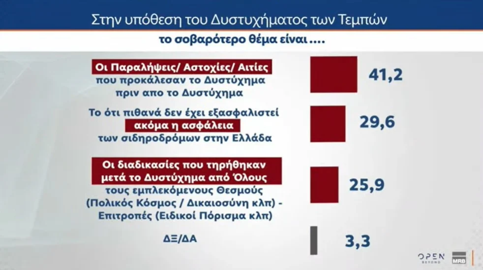 Το 76,8% δηλώνει ότι η άποψή του παραμένει αρνητική απέναντι στην κυβέρνηση της ΝΔ, ως προς το δυστύχημα των Τεμπών.