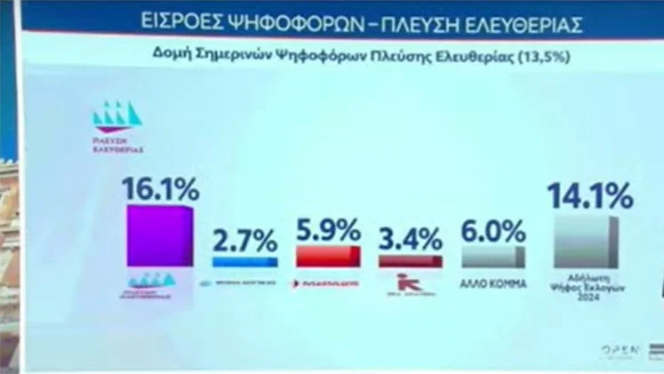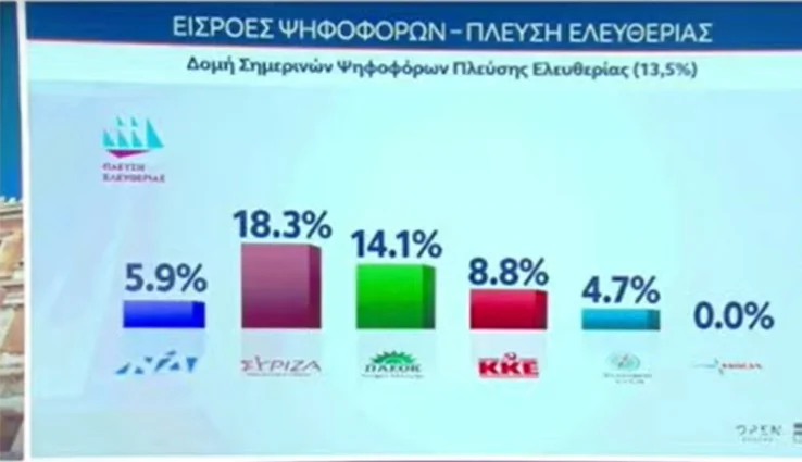 Όσον αφορά τις εισροές στο κόμμα της Πλεύσης Ελευθερίας, το 18,3% προέρχεται από τον ΣΥΡΙΖΑ, το 14,1% από το ΠΑΣΟΚ, το 8,8% από το ΚΚΕ, το 5,9% από τη ΝΔ.