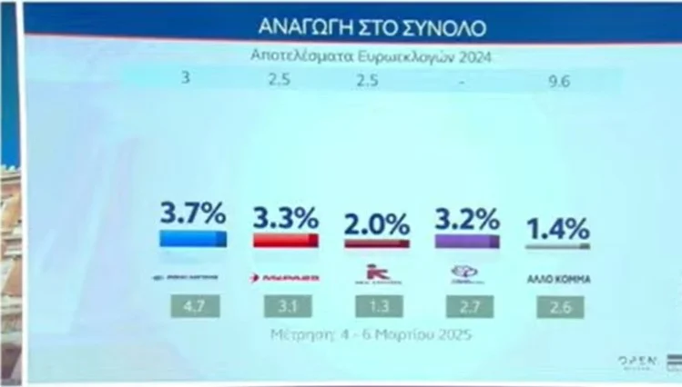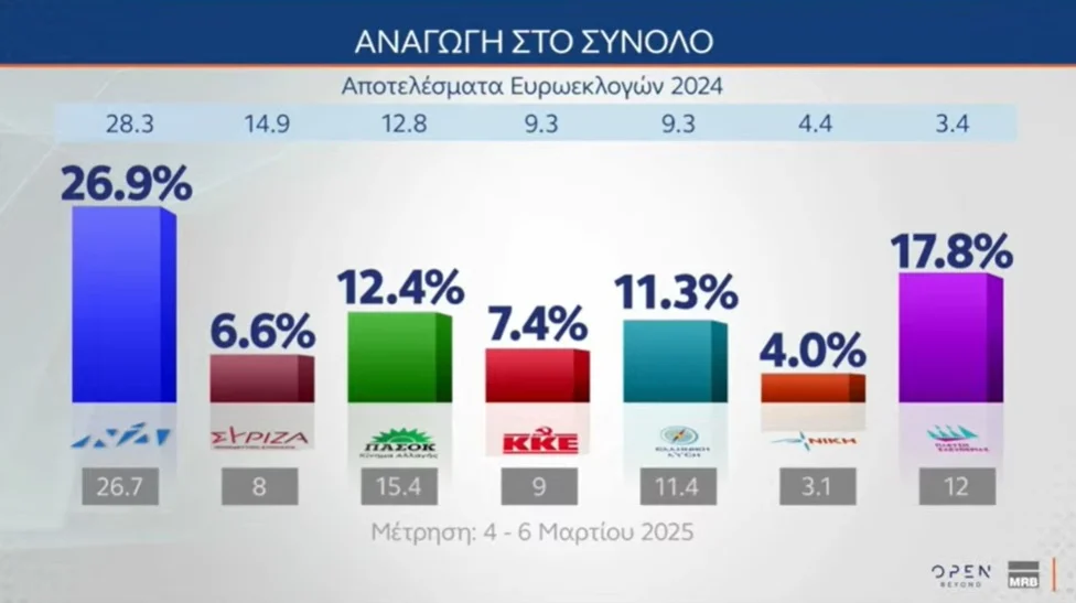 Στην αναγωγή στο σύνολο, το ποσοστό της ΝΔ είναι στο 26,9%, η Πλεύση Ελευθερίας 17,8%, το ΠΑΣΟΚ 12,4%, η Ελληνική Λύση 11,3%, το ΚΚΕ 7,4%, ο ΣΥΡΙΖΑ 6,6%, η Νίκη 4%, η Φωνή Λόγικής 3,7%, το ΜέΡΑ25 3,3%, το Κίνημα Δημοκρατίας 3,2%, η Νέα Αριστερά 2%.