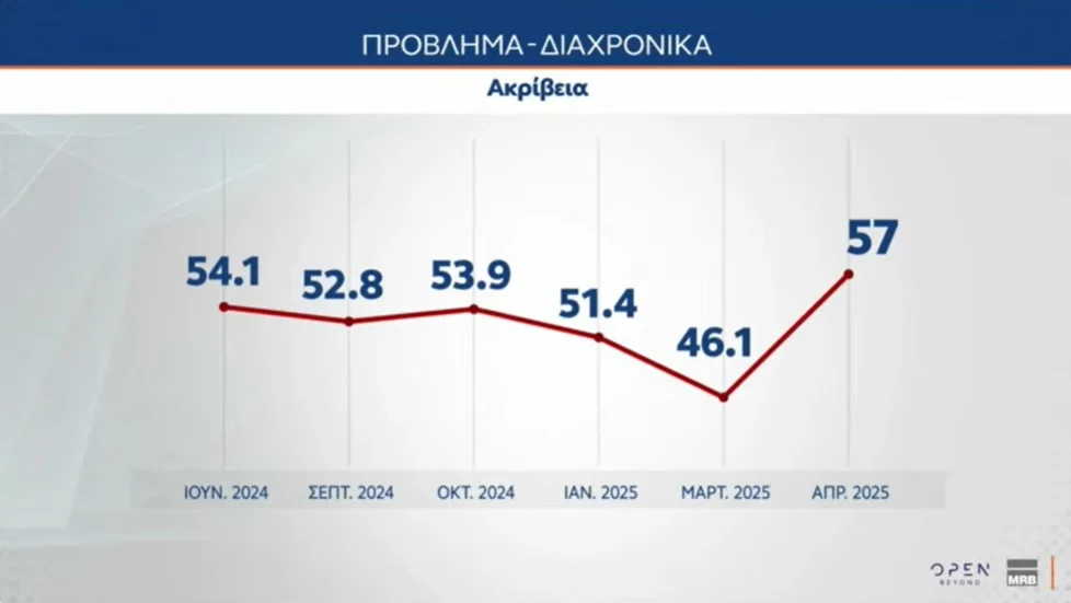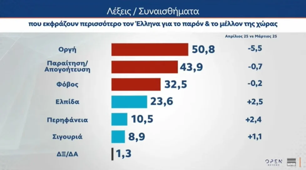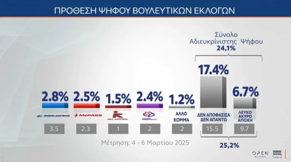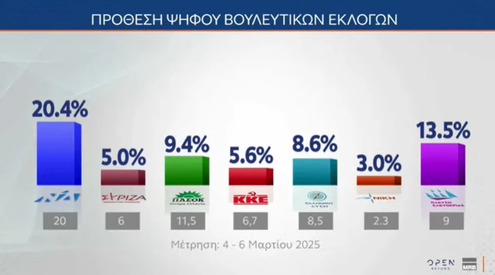 Σύμφωνα με την έρευνα της MRB, για λογαριασμό του Open, στην πρόθεση ψήφου η ΝΔ λαμβάνει 20,4%, η Πλεύση Ελευθερίας 13,5%, το ΠΑΣΟΚ 9,4%, η Ελληνική Λύση 8,6%, το ΚΚΕ 5,6%, ο ΣΥΡΙΖΑ 5%, η Νίκη 3%, η Φωνή Λογικής 2,8%, το ΜέΡΑ25 2,5%, το Κίνημα Δημοκρατίας 2,4%, η Νέα Αριστερά 1,5%, ενώ το σύνολο της αδιευκρίνιστης ψήφου είναι στο 24,1%.