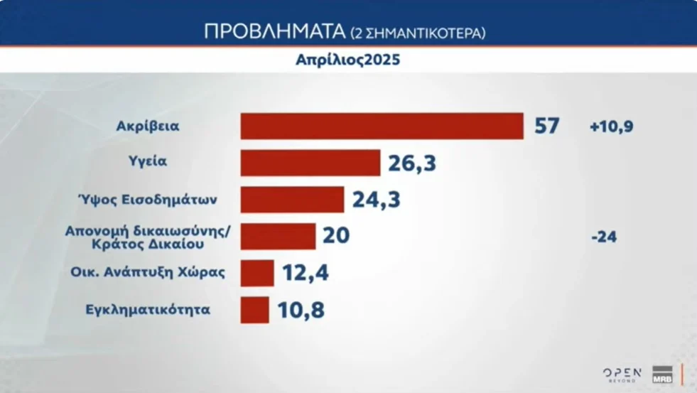 Στην καταλληλότητα για την πρωθυπουργία, πρώτος είναι ο «Κανένας» με 33,3%, ο Κ. Μητσοτάκης 21,4%, η Ζ. Κωνσταντοπούλου 13,2% (+5,2%), ο Κ. Βελόπουλος 5,9%, ο Ν. Ανδρουλάκης 4,7% (-2,3%).
