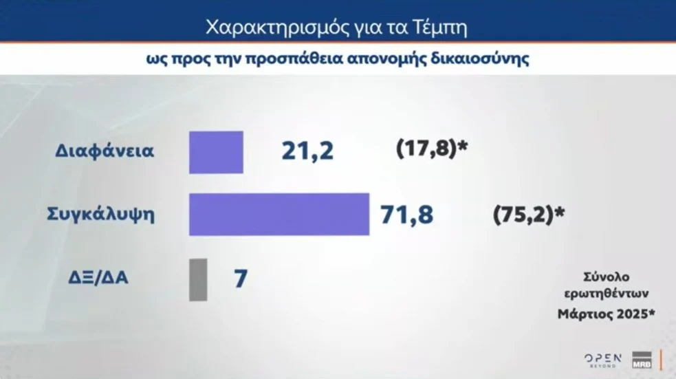 Την ίδια ώρα, το 71,8% χαρακτηρίζει τα Τέμπη ως υπόθεση συγκάλυψης.
