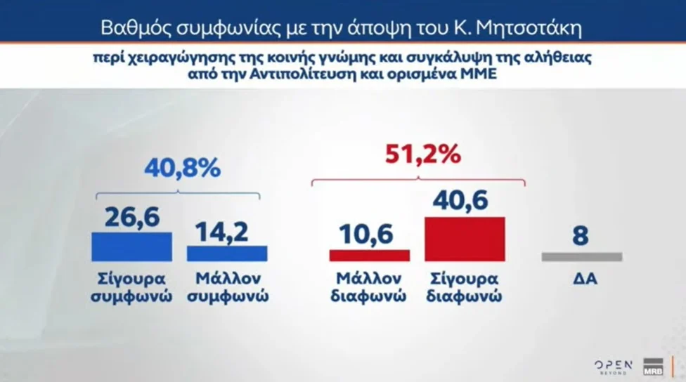 Σύμφωνα με την έρευνα της MRB, το 51,2% δηλώνει ότι «Μάλλον διαφωνεί/Σίγουρα διαφωνεί» με την άποψη του πρωθυπουργού περί «χειραγώγησης της κοινής γνώμης και συγκάλυψη της αλήθειας» στην υπόθεση των Τεμπών, με το 40,8% ωστόσο να δηλώνει ότι «Σίγουρα συμφωνεί/Μάλλον συμφωνεί» με την άποψη του Κ. Μητσοτάκη.