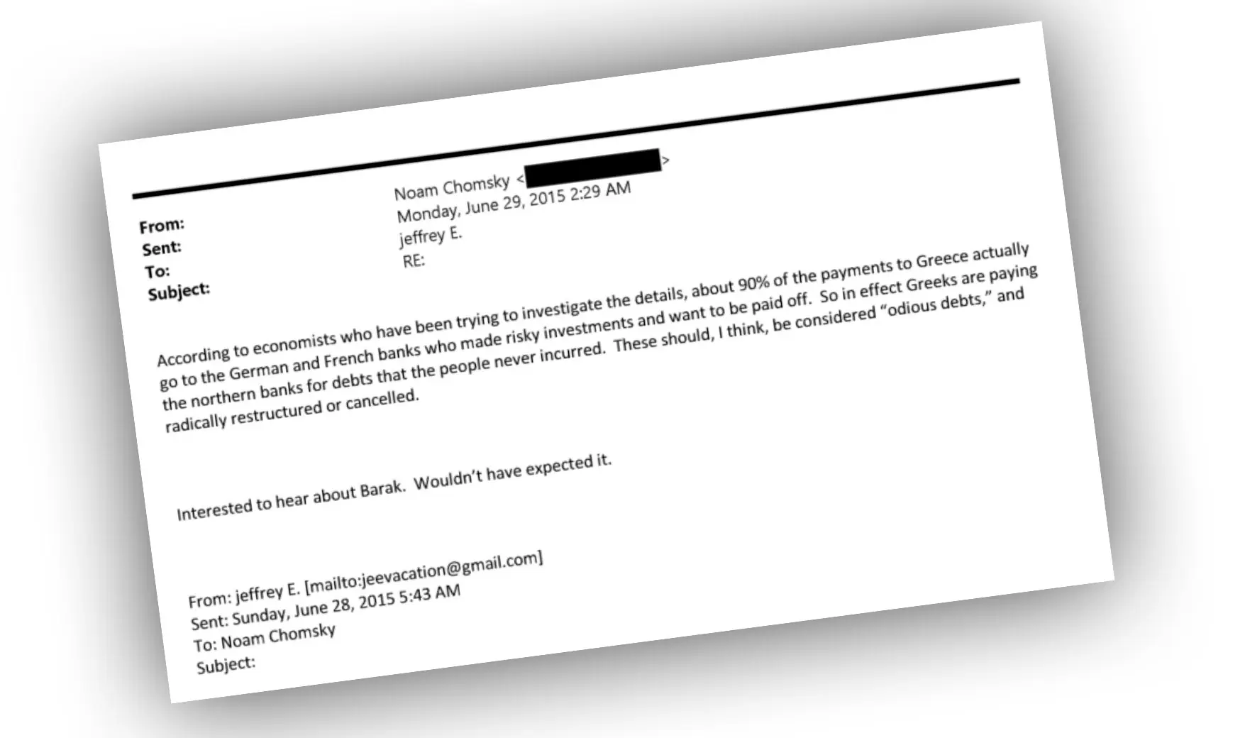 Στις πολλές αναφορές τις λέξεις Ελλάδα ξεχωρίζει μία ανταλλαγή e-mails ανάμεσα στον Έπστιν και στον Τσόμσκι με ημερομηνία 29 Ιουνίου 2015.