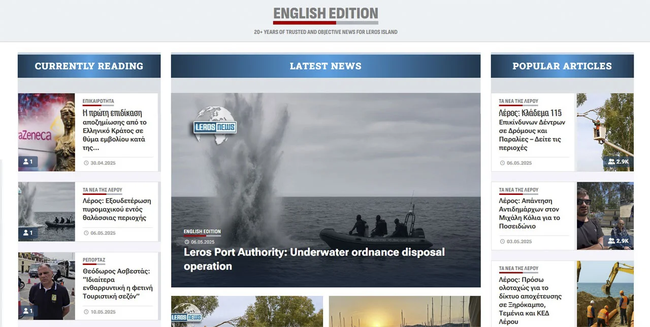 With more than twenty years of continuous presence and pioneering work in local news coverage, Leros News is taking yet another important step forward. As of 1 May 2025, the website now features an English edition of its most significant articles, aimed at English-speaking residents, visitors, and readers both on Leros and abroad.