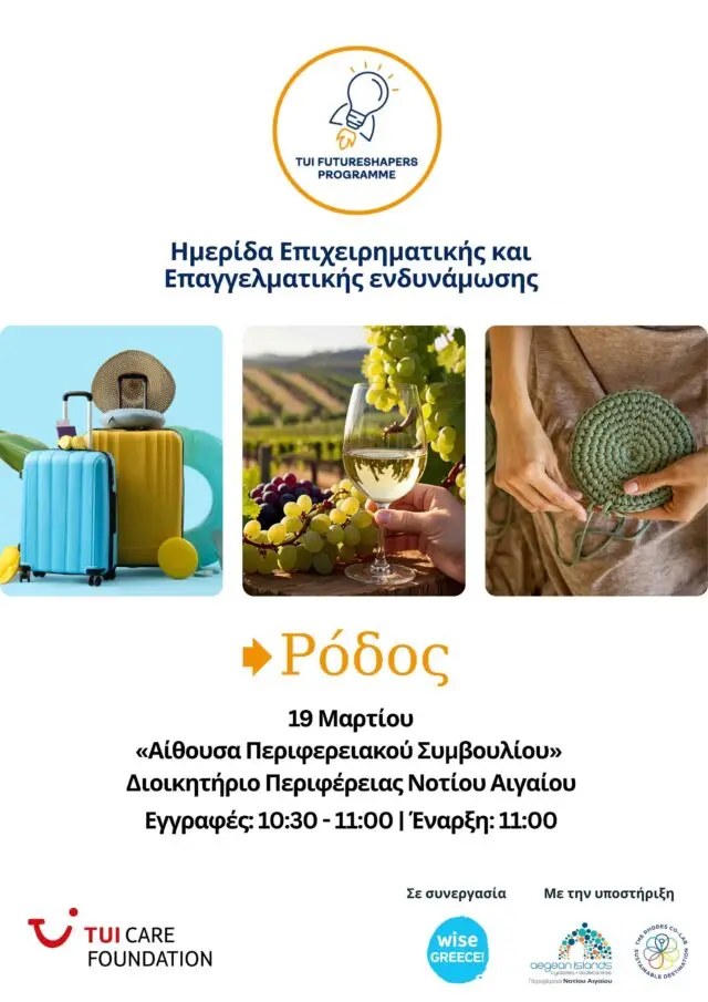 Η Περιφέρεια Νοτίου Αιγαίου, στο πλαίσιο των πρωτοβουλιών της για την ενίσχυση της τοπικής επιχειρηματικότητας και την υποστήριξη των επαγγελματιών της περιοχής, φιλοξενεί και υποστηρίζει την Ημερίδα Επιχειρηματικής και Επαγγελματικής Ενδυνάμωσης, που διοργανώνει η Wise Greece, με την υποστήριξη του TUI Care Foundation και σε συνεργασία με το The Rhodes Co-Lab Sustainable Destination.