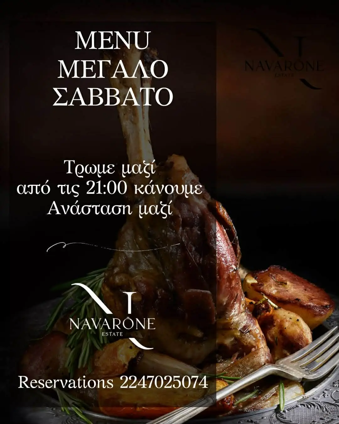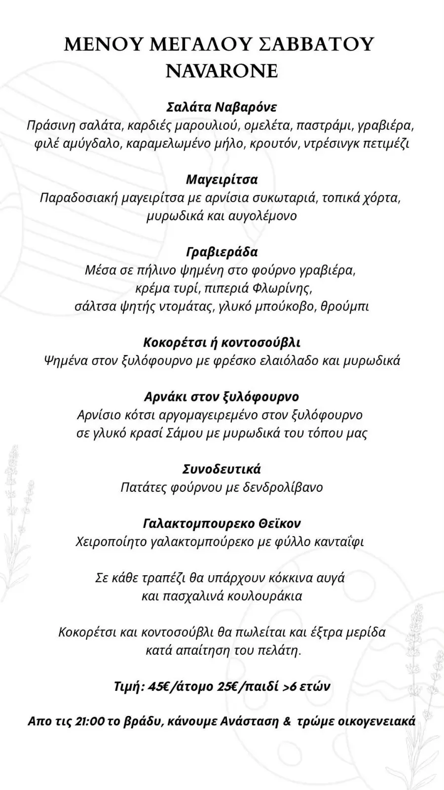 Η νέα αυτή προσπάθεια αναμένεται να αποτυπωθεί άμεσα και στο πασχαλινό τραπέζι του Navarone. Η αρχή θα γίνει τη Μεγάλη Παρασκευή, με ένα ξεχωριστό σαρακοστιανό menu, σχεδιασμένο με έμφαση στην ποιότητα των πρώτων υλών και στην ισορροπία των γεύσεων. Η συνέχεια έρχεται το Μεγάλο Σάββατο, μετά την Ανάσταση, με ένα menu που φιλοδοξεί να αποτελέσει σημείο αναφοράς στα γαστρονομικά δρώμενα της Λέρου.
