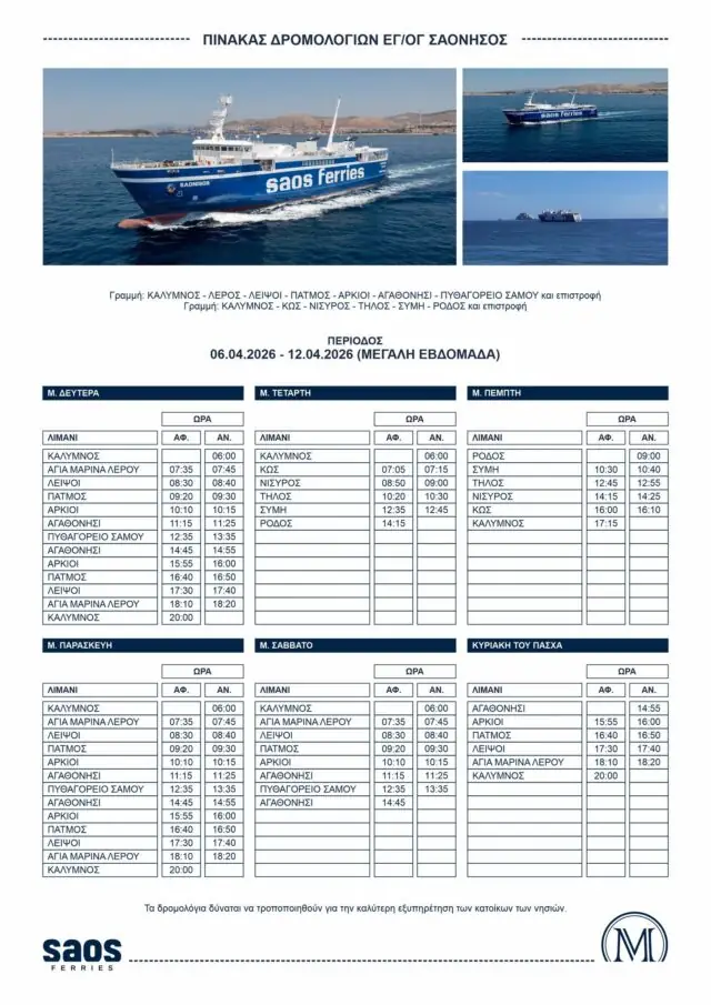 Η SAOS Ferries ανακοίνωσε τον πίνακα δρομολογίων του Ε/Γ-Ο/Γ «ΣΑΟΝΗΣΟΣ» για την περίοδο της Μεγάλης Εβδομάδας, από 6 έως 12 Απριλίου 2026, με δρομολόγια που συνδέουν τη Λέρο (Αγία Μαρίνα) με Κάλυμνο, Λειψούς, Πάτμο, Αρκιούς, Αγαθονήσι και Πυθαγόρειο Σάμου, καθώς και τη γραμμή προς Κω, Νίσυρο, Τήλο, Σύμη και Ρόδο.