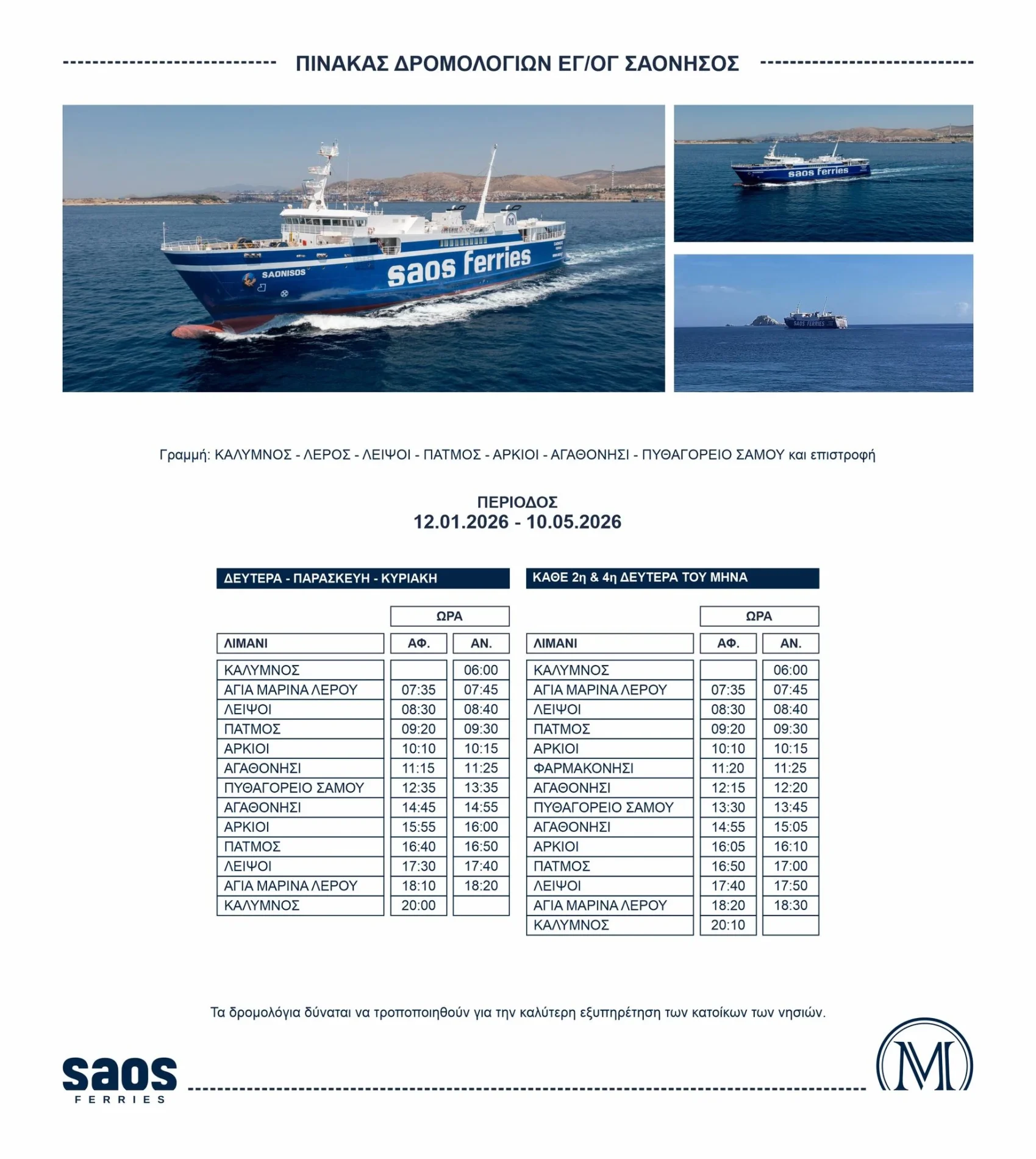 Η SAOS Ferries ανακοίνωσε το πρόγραμμα δρομολογίων του Ε/Γ-Ο/Γ πλοίου «ΣΑΟΝΗΣΟΣ», το οποίο θα ισχύει από 12/01/2026 έως και 10/05/2026, καλύπτοντας κρίσιμες ακτοπλοϊκές συνδέσεις στα Δωδεκάνησα.
