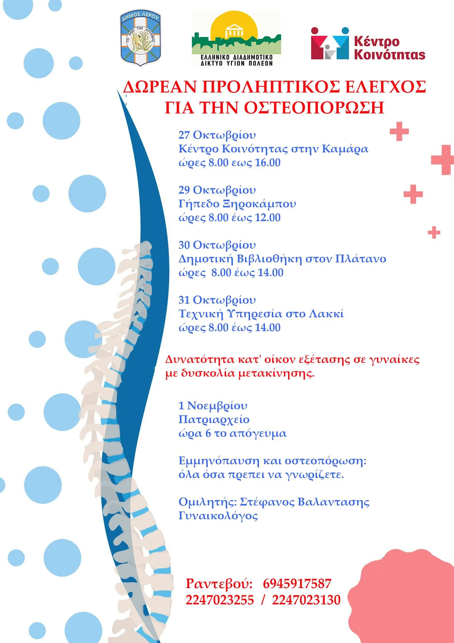 Ο δήμος Λέρου, στο πλαίσιο των δράσεων προληπτικής ιατρικής που εφαρμόζει, σε συνεργασία με το Εθνικό Διαδημοτικό Δίκτυο Υγειών Πόλεων, διοργανώνει από τις 27 έως 31 Οκτωβρίου δωρεάν μέτρηση οστικής πυκνότητας με σκοπό την πρόληψη και την έγκαιρη διάγνωση της οστεοπόρωσης.