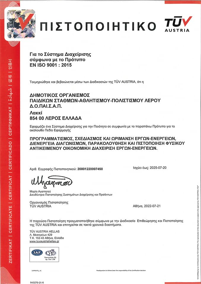 Τη διεθνή πιστοποίηση ISO 9001-2015 απέκτησε ο Δημοτικός Οργανισμός Παιδικών Σταθμών – Αθλητισμού – Πολιτισμού Λέρου, μετά από ενδελεχή επιθεώρηση και έλεγχο των υπηρεσιών του από την TÜV AUSTRIA Hellas, που θεωρείται ο κορυφαίος οργανισμός πιστοποίησης και Επιθεωρήσεων στην Ελλάδα.