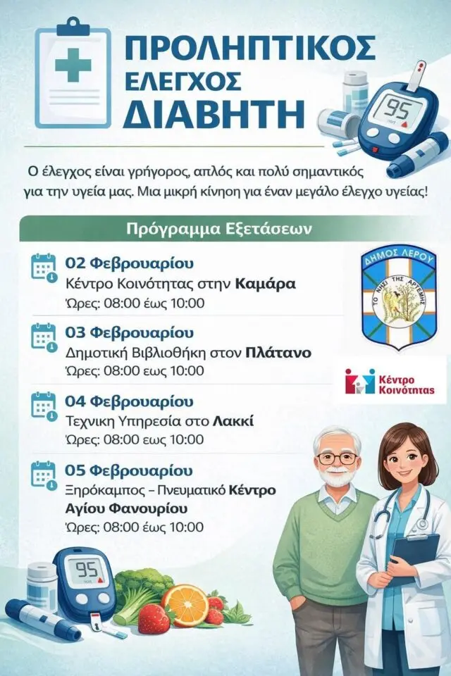 Το Κέντρο Κοινότητας του Δήμου Λέρου ενημερώνει τους δημότες ότι θα πραγματοποιηθεί δωρεάν προληπτικός έλεγχος σακχάρου αίματος (εξέταση διαβήτη), για ενήλικες, στο πλαίσιο δράσεων πρόληψης και προαγωγής της υγείας, από 02 έως 05 Φεβρουαρίου.
