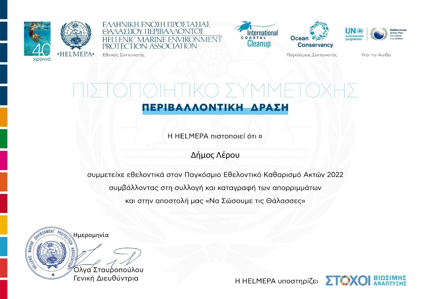 Μετά την επιτυχημένη συμμετοχή του Δήμου και των σχολικών μονάδων του νησιού μας, στον Παγκόσμιο Εθελοντικό Καθαρισμό Ακτών της HELMEPA, λάβαμε το πιστοποιητικό συμμετοχής.