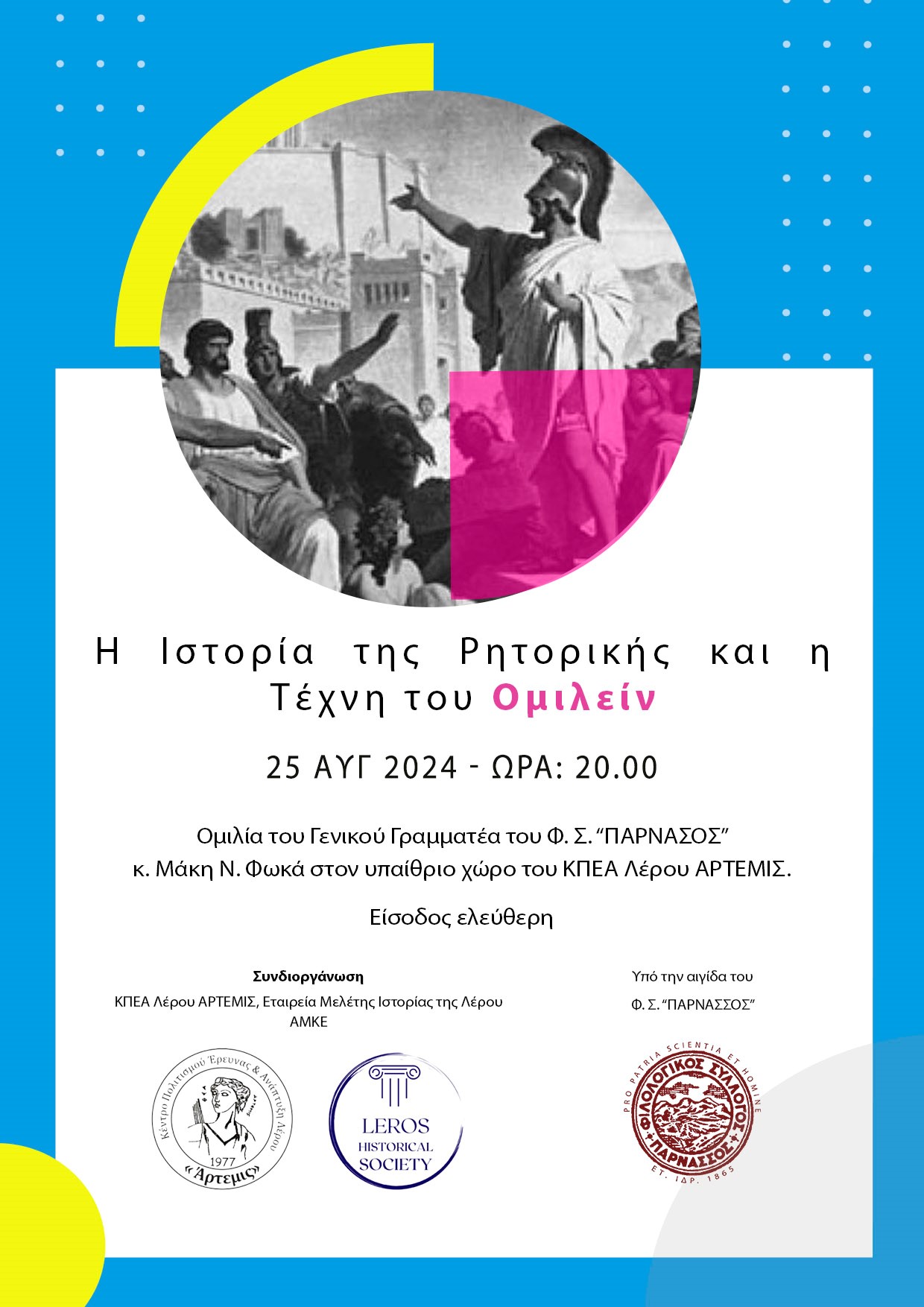 Το Κέντρο Πολιτισμού Έρευνας και Ανάπτυξης Λέρου “Άρτεμις” σε συνεργασία με την Εταιρεία Μελέτης της Ιστορίας της Λέρου / Leros Historical Society , διοργανώνουν στο αίθριο της Άρτεμις την Κυριακή 25 Αυγούστου και ώρα 20:00 ομιλία με θέμα “Η ιστορία της ρητορικής και τέχνη του ομιλείν”.