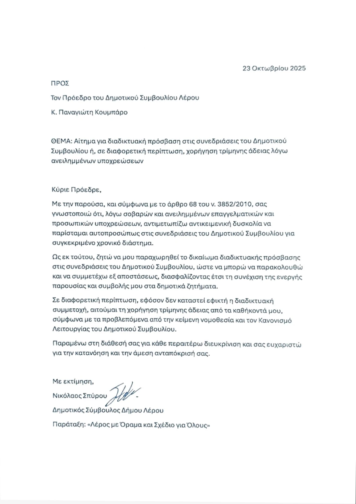 Δελτίο Τύπου εξέδωσε ο δημοτικός σύμβουλος Λέρου Νίκος Σπύρου, με το οποίο γνωστοποιεί ότι κατέθεσε αίτημα προς τον Πρόεδρο του Δημοτικού Συμβουλίου για τη δυνατότητα διαδικτυακής συμμετοχής στις συνεδριάσεις του οργάνου, λόγω αντικειμενικής αδυναμίας φυσικής παρουσίας για συγκεκριμένο χρονικό διάστημα.
