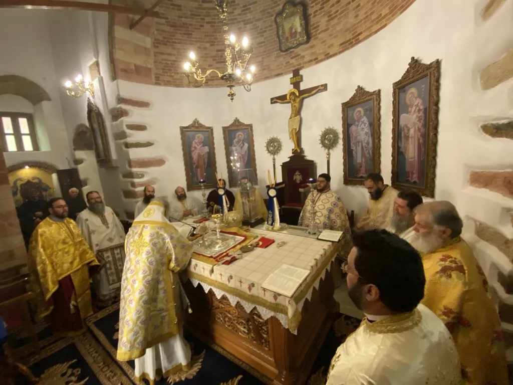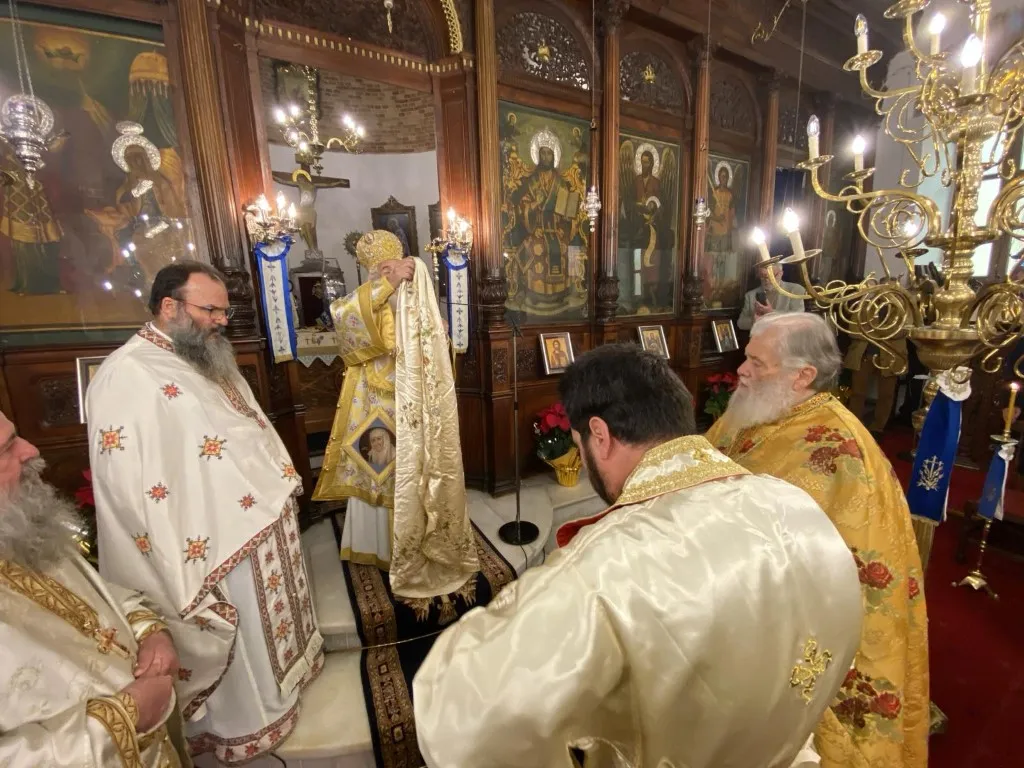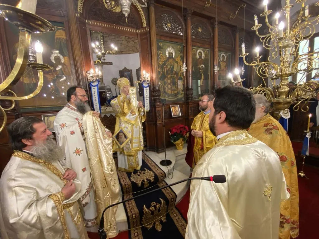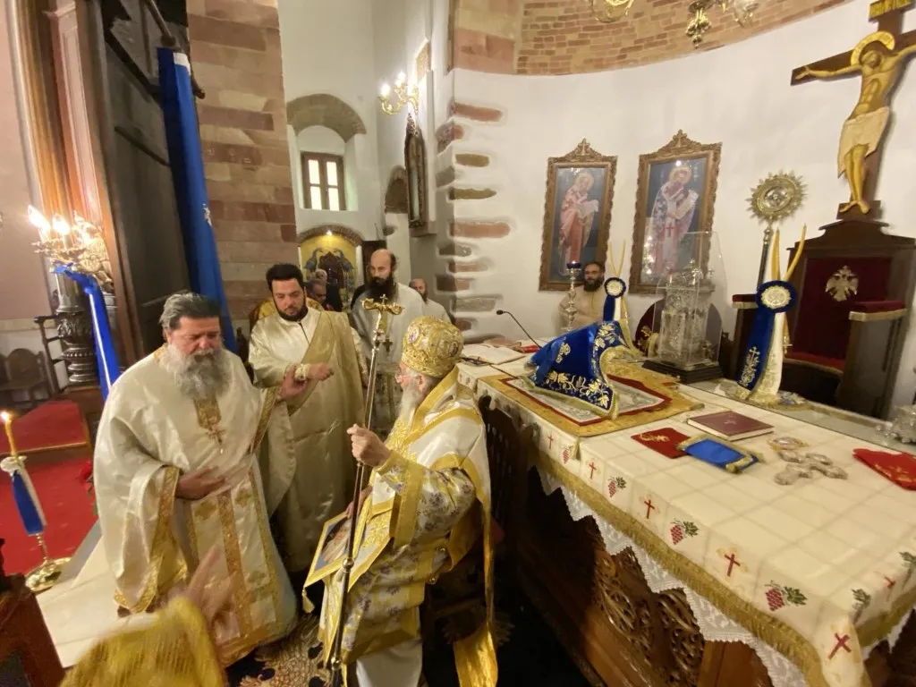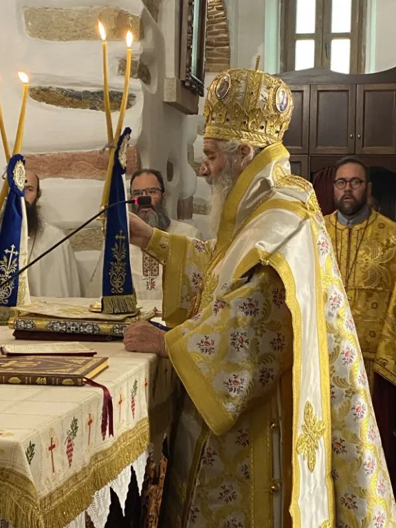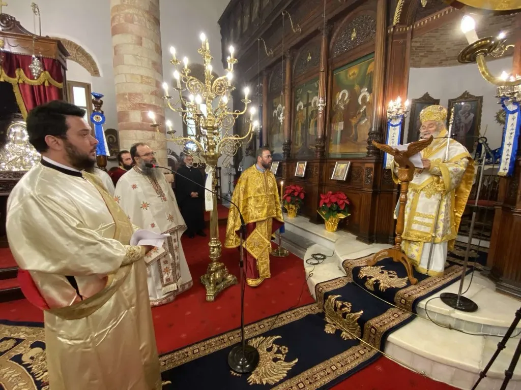 Ο Σεβασμιώτατος Μητροπολίτης μας κ. Παΐσιος χοροστάτησε στην ακολουθία του Όρθρου και προεξήρχε της Θείας Λειτουργίας, συμπαραστατούμενος υπό του Πανοσιολ. Αρχιμανδρίτου π. Ιωαννικίου Αναγνώστου, ηγουμένου της Ιεράς Μονής Παναγίας Φανερωμένης Ιξιάς Ρόδου, του Αρχιερατικού Επιτρόπου Λέρου π. Νικοδήμου Φωκά, του Εφημερίου του Ι. Ναού π. Νικολάου Ταχλιαμπούρη, και πλειάδος Ιερέων της Ιεράς Μητροπόλεως. Στο ιερό αναλόγιο έψαλλε χορωδία καλλίφωνων ιεροψαλτών υπό την διεύθυνση του μουσικολογιωτάτου Αναστασίου Χατζηλάρη.