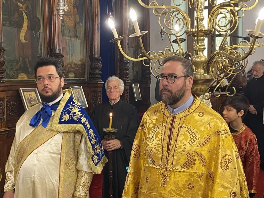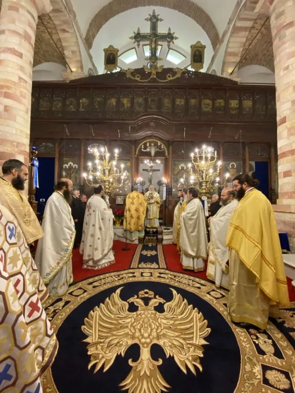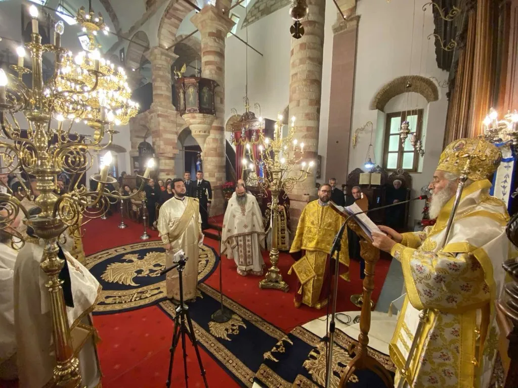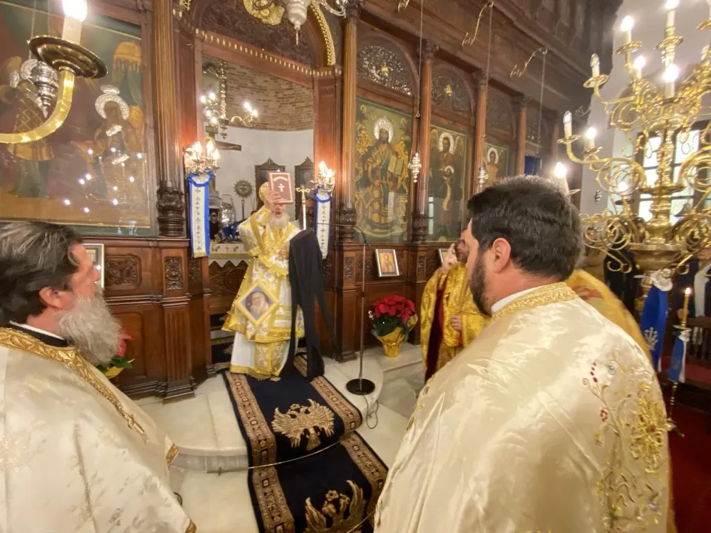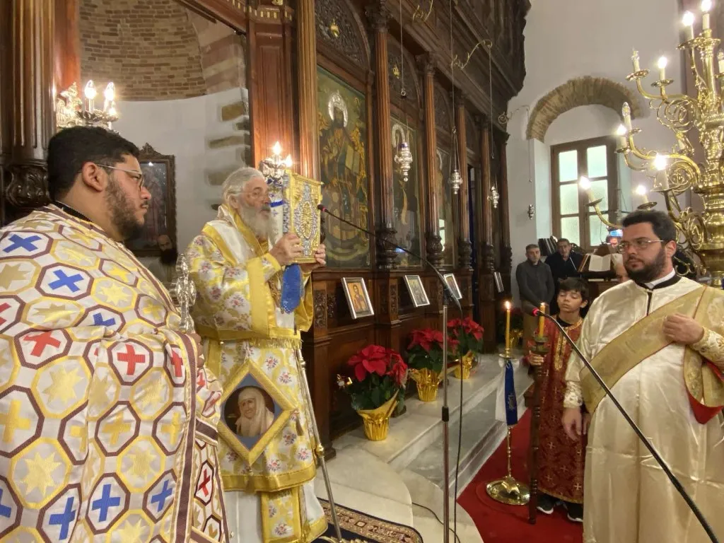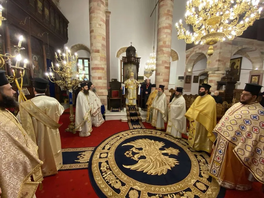 Ο Σεβασμιώτατος Μητροπολίτης μας κ. Παΐσιος χοροστάτησε στην ακολουθία του Όρθρου και προεξήρχε της Θείας Λειτουργίας, συμπαραστατούμενος υπό του Πανοσιολ. Αρχιμανδρίτου π. Ιωαννικίου Αναγνώστου, ηγουμένου της Ιεράς Μονής Παναγίας Φανερωμένης Ιξιάς Ρόδου, του Αρχιερατικού Επιτρόπου Λέρου π. Νικοδήμου Φωκά, του Εφημερίου του Ι. Ναού π. Νικολάου Ταχλιαμπούρη, και πλειάδος Ιερέων της Ιεράς Μητροπόλεως. Στο ιερό αναλόγιο έψαλλε χορωδία καλλίφωνων ιεροψαλτών υπό την διεύθυνση του μουσικολογιωτάτου Αναστασίου Χατζηλάρη.