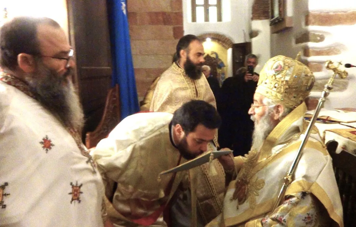 Ἀδείᾳ τοῦ Σεβαμιωτάτου προσφιλοῦς καί λίαν ἀγαπητοῦ μοι Ἁγίου Ρόδου κ. κ. Κυρίλλου, κυριάρχου Μητροπολίτου σου, τόν ὁποῖον καί εὐγνωμόνως εὐχαριστῶ ἐκ βάθους καρδίας διά τήν προσγενομένην τιμήν πρός ἐμέ τόν ἐλάχιστον Ἐπίσκοπον σήμερον χάριτι θεία νά σέ καλέσω νά λάβῃς ὑπό τῶν χειρῶν μου τόν δεύτερον βαθμόν τῆς Ἱερωσύνης, πού κατά τόν θεῖον Γρηγόριον τόν Θεολόγον «ἔστι τέχνη τεχνῶν καί ἐπιστήμη ἐπιστημῶν». Ὁ δέ χρυσοῦς τῇ γλώττᾳ Ἰωάννης ὁ Χρυσόστομος, λέγει «Σεμνόν τό τῆς Ἱερωσύνης ἀξίωμα».