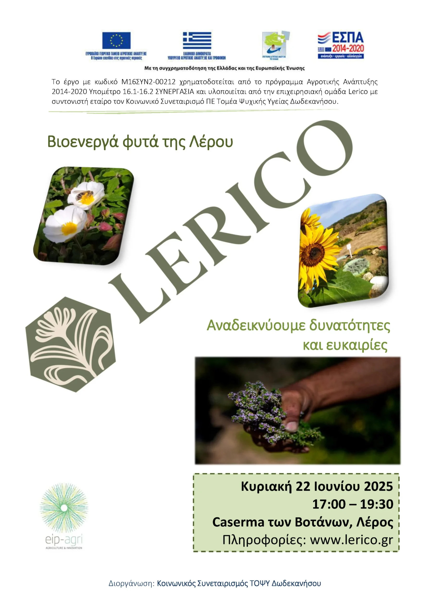 Την Κυριακή 22 Ιουνίου 2025 στις 17:00 στο επισκέψιμο Αγρόκτημα Caserma των Βοτάνων στο Κουλούκι Λέρου, θα πραγματοποιηθεί εκδήλωση παρουσίασης των αποτελεσμάτων του έργου με τίτλο «Βιοενεργά φυτά της Λέρου. Αναδεικνύουμε δυνατότητες και ευκαιρίες». Το έργο υλοποιείται από την Επιχειρησιακή Ομάδας LERICO στο πλαίσιο της Δράσης 2 του Υπομέτρου 16.1 – 16.2 «Ίδρυση και λειτουργία Επιχειρησιακών Ομάδων της Ευρωπαϊκής Σύμπραξης Καινοτομίας για την παραγωγικότητα και τη βιωσιμότητα της γεωργίας» του Προγράμματος Αγροτικής Ανάπτυξης (ΠΑΑ) 2014 – 2020.