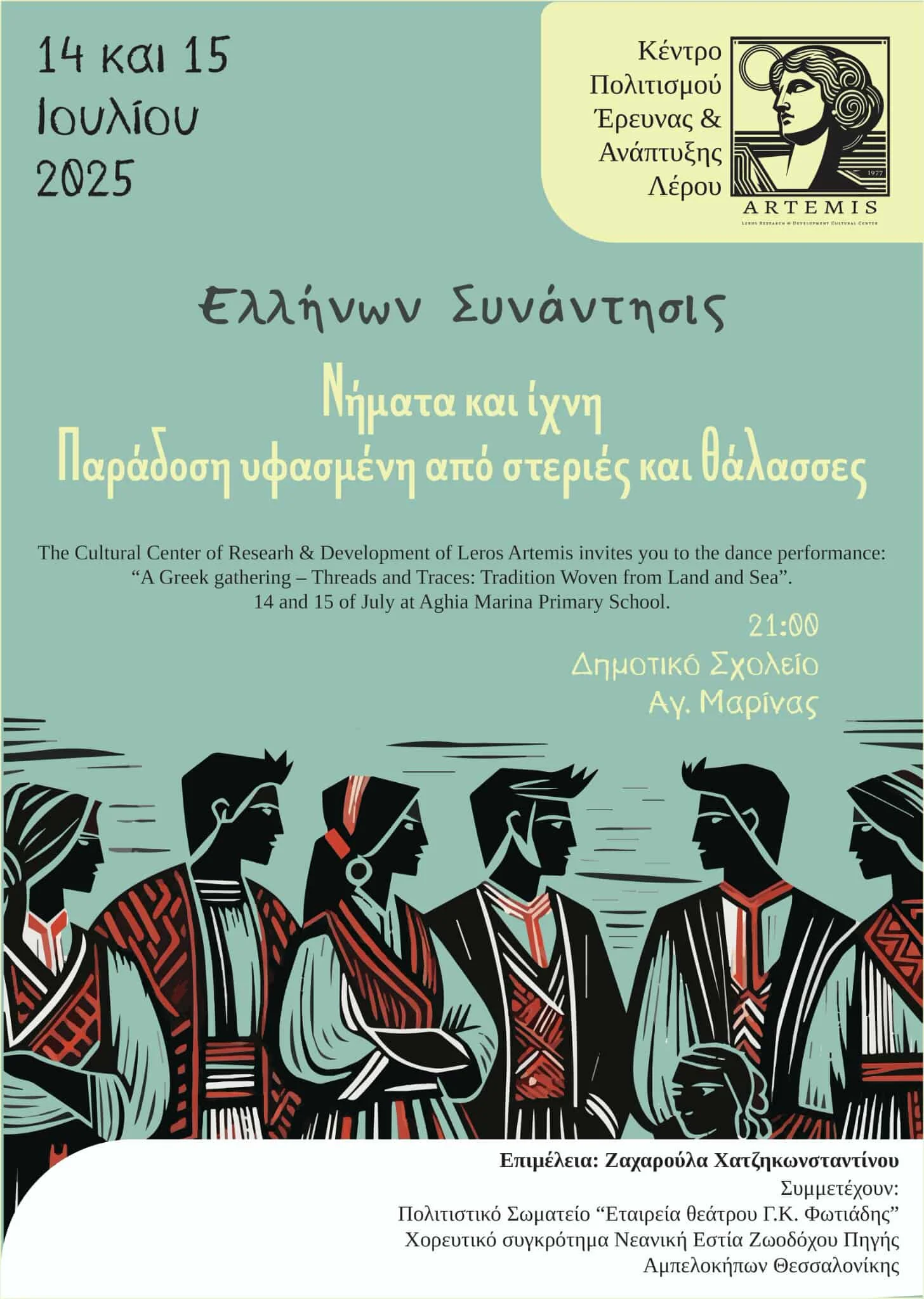 Το Κέντρο Πολιτισμού Έρευνας και Ανάπτυξης Λέρου «Άρτεμις» σας προσκαλεί σε μια ξεχωριστή χορευτική εκδήλωση με τίτλο: “Ελλήνων Συνάντησις – Νήματα και Ίχνη: Παράδοση υφασμένη από στεριές και θάλασσες”