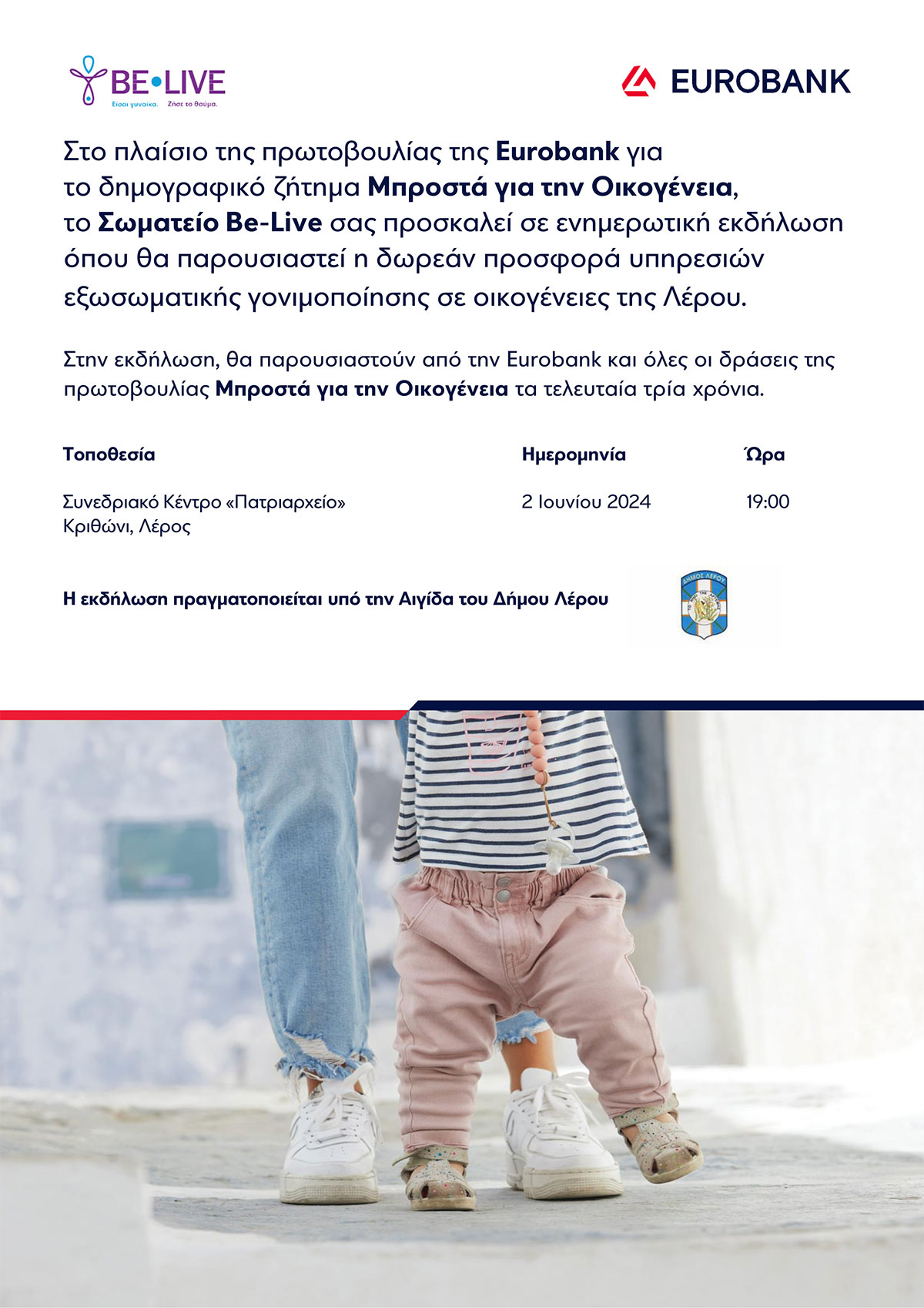 Την Κυριακή 2 Ιουνίου θα βρίσκεται στη Λέρο το μη κερδοσκοπικό Σωματείο για την αντιμετώπιση της υπογεννητικότητας και της υπογονιμότητας Be-Live, προκειμένου να πραγματοποιήσει ενημερωτική εκδήλωση. Η εκδήλωση θα γίνει στις 19:00 στο Συνεδριακό Κέντρο «Πατριαρχείο», στο Κριθώνι, υπό την Αιγίδα του Δήμου Λέρου, στο πλαίσιο της πρωτοβουλίας Εταιρικής Κοινωνικής Ευθύνης της Eurobank για το δημογραφικό ζήτημα «ΜΠΡΟΣΤΑ για την Οικογένεια».