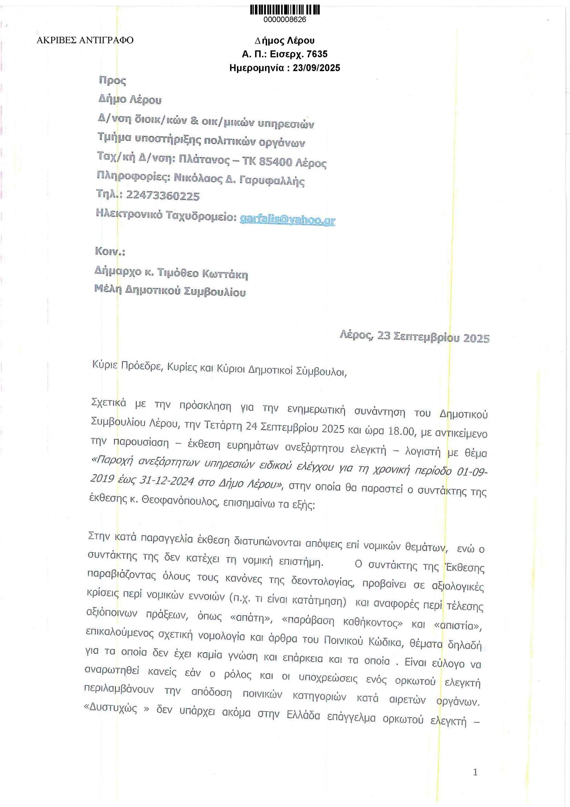 Σχετικά με την πρόσκληση για την ενημερωτική συνάντηση του Δημοτικού Συμβουλίου Λέρου, την Τετάρτη 24 Σεπτεμβρίου 2025 και ώρα 18.00, με αντικείμενο την παρουσίαση – έκθεση ευρημάτων ανεξάρτητου ελεγκτή – λογιστή με θέμα «Παροχή ανεξάρτητων υπηρεσιών ειδικού ελέγχου για τη χρονική περίοδο 01-09-2019 έως 31-12-2024 στο Δήμο Λέρου», στην οποία θα παραστεί ο συντάκτης της έκθεσης κ. Θεοφανόπουλος, επισημαίνω τα εξής: