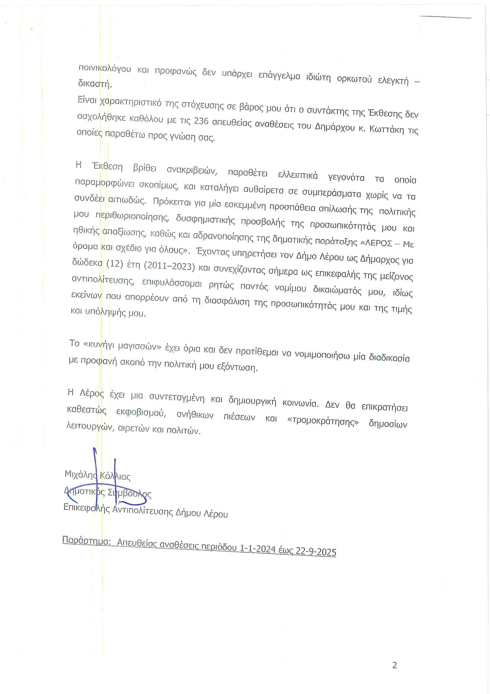 Η Έκθεση βρίθει ανακριβειών, παραθέτει ελλιπτικά γεγονότα τα οποία παραμορφώνει σκοπίμως, και καταλήγει αυθαίρετα σε συμπεράσματα χωρίς να τα συνδέει αιτιωδώς. Πρόκειται για μία εσκεμμένη προσπάθεια σπίλωσης της πολιτικής μου περιθωριοποίησης, δυσφημιστικής προσβολής της προσωπικότητάς μου και ηθικής απαξίωσης, καθώς και αδρανοποίησης της δημοτικής παράταξης «ΛΕΡΟΣ – Με όραμα και σχέδιο για όλους». Έχοντας υπηρετήσει τον Δήμο Λέρου ως Δήμαρχος για δώδεκα (12) έτη (2011–2023) και συνεχίζοντας σήμερα ως επικεφαλής της μείζονος αντιπολίτευσης, επιφυλάσσομαι ρητώς παντός νομίμου δικαιώματός μου, ιδίως εκείνων που απορρέουν από τη διασφάλιση της προσωπικότητάς μου και της τιμής και υπόληψής μου.