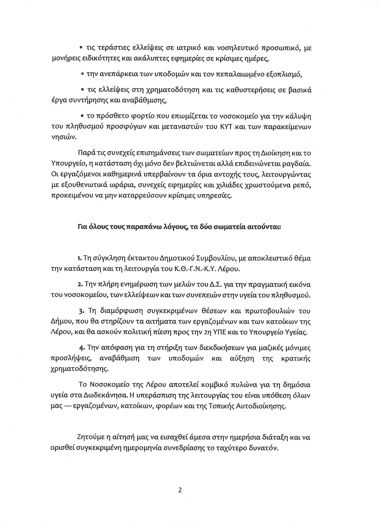 Σήμερα το πρωί κατατέθηκε από κοινού προς το Δήμο της Λέρου αίτηση για σύγκληση έκτακτου Δημοτικού Συμβουλίου από την Ένωση Υπαλλήλων και την Ένωση Ιατρών του ΚΘ-ΓΝ-ΚΥ Λέρου.