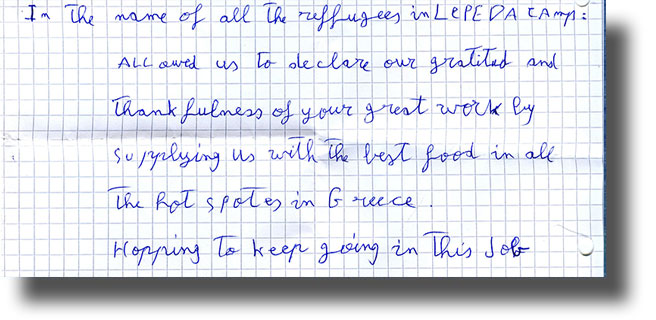 Στο χειρόγραφο γραμμα των προσφύγων που δημοσιεύουμε αναφέρουν οι πρόσφυγες την ευγνωμοσύνη τους προς τον Θανάση Σκορδάλη χαρακτηρίζοντας το φαγητό που τους προσφέρει ως το καλύτερο από όλα τα HOT SPOT της χώρας.