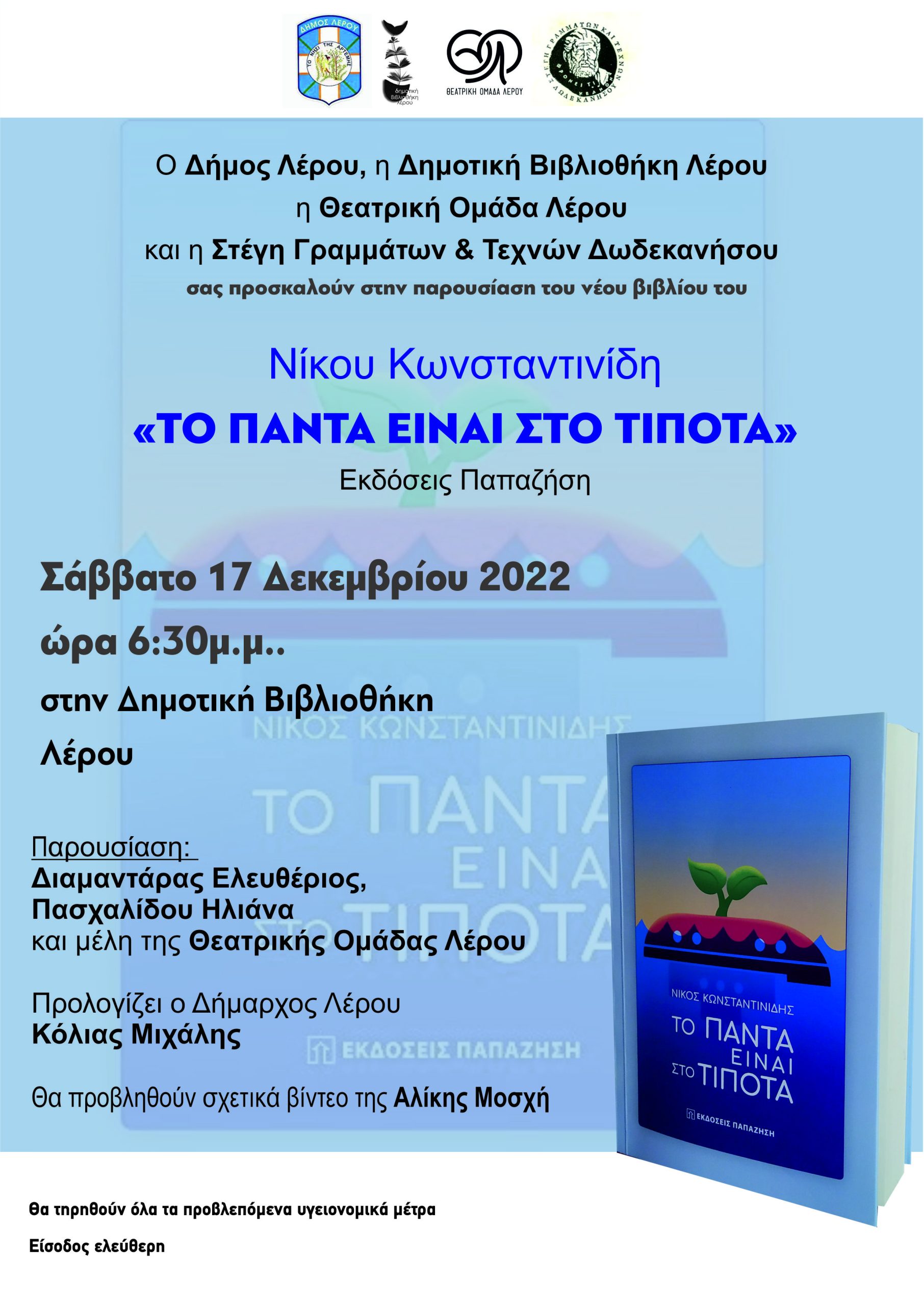 Ο Δήμος Λέρου, η Δημοτική Βιβλιοθήκη Λέρου, η Θεατρική Ομάδα Λέρου και η Στέγη Γραμμάτων & Τεχνών Δωδεκανήσου, σας προσκαλούν