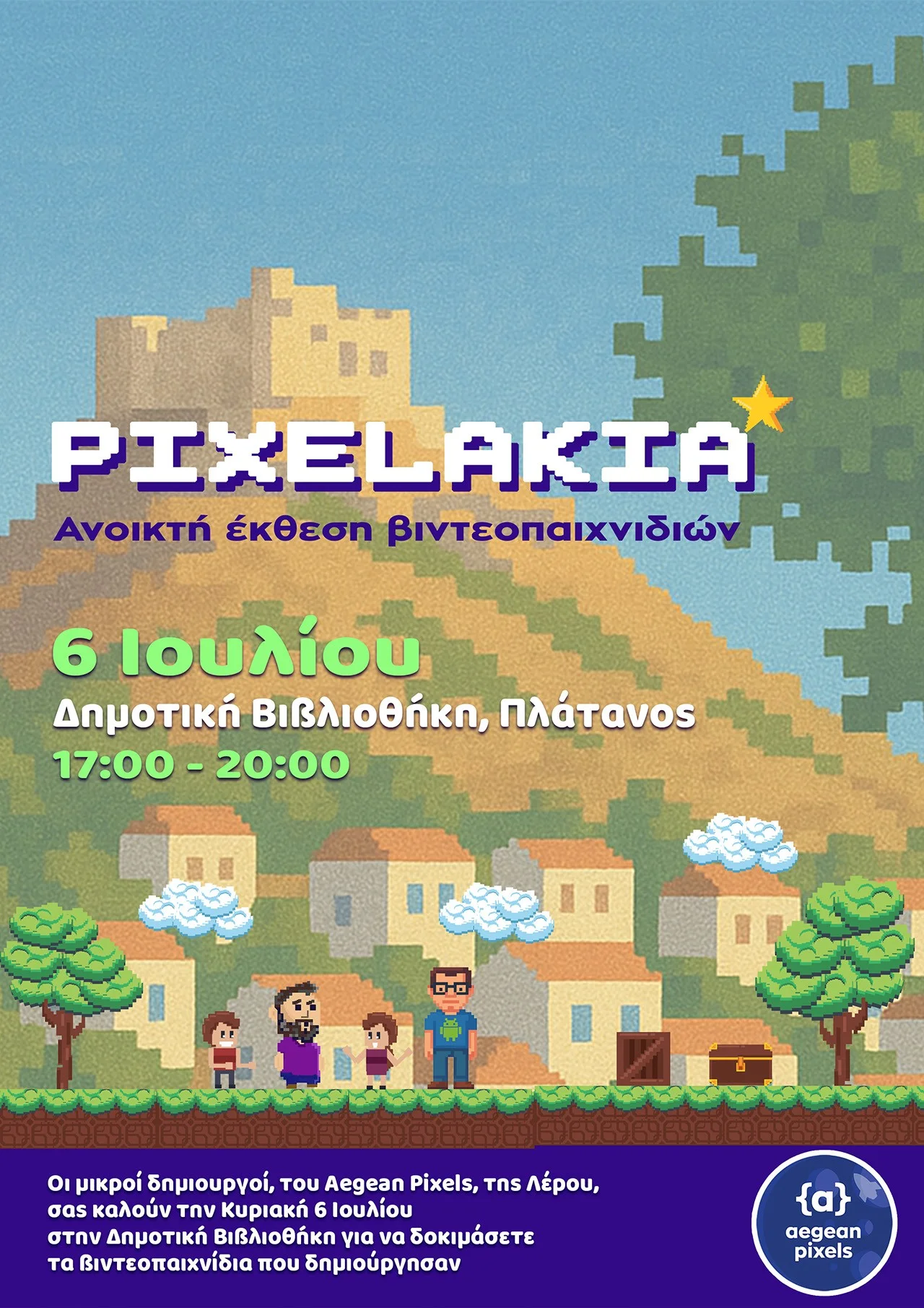 Για πρώτη φορά στη Λέρο, παιδιά ηλικίας 09 έως 14 ετών θα παρουσιάσουν στο κοινό τα δικά τους πρωτότυπα βιντεοπαιχνίδια, τα οποία δημιούργησαν στο πλαίσιο του Aegean Pixels Academy.
