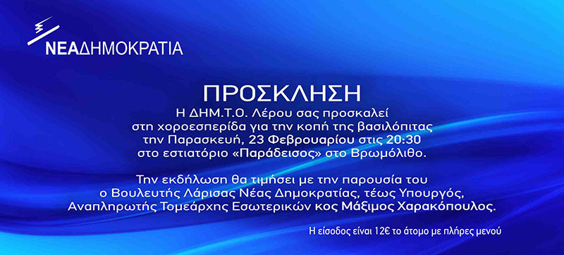 Σας προσκαλούμε στην εκδήλωση της ΔΗΜ. Τ.Ο. Λέρου, για την κοπή της Πρωτοχρονιάτικης πίτας, που θα πραγματοποιηθεί την Παρασκευή 23 Φεβρουαρίου και ώρα 20:30, στο εστιατόριο «Παράδεισος» στο Βρωμόλιθο Λέρου.