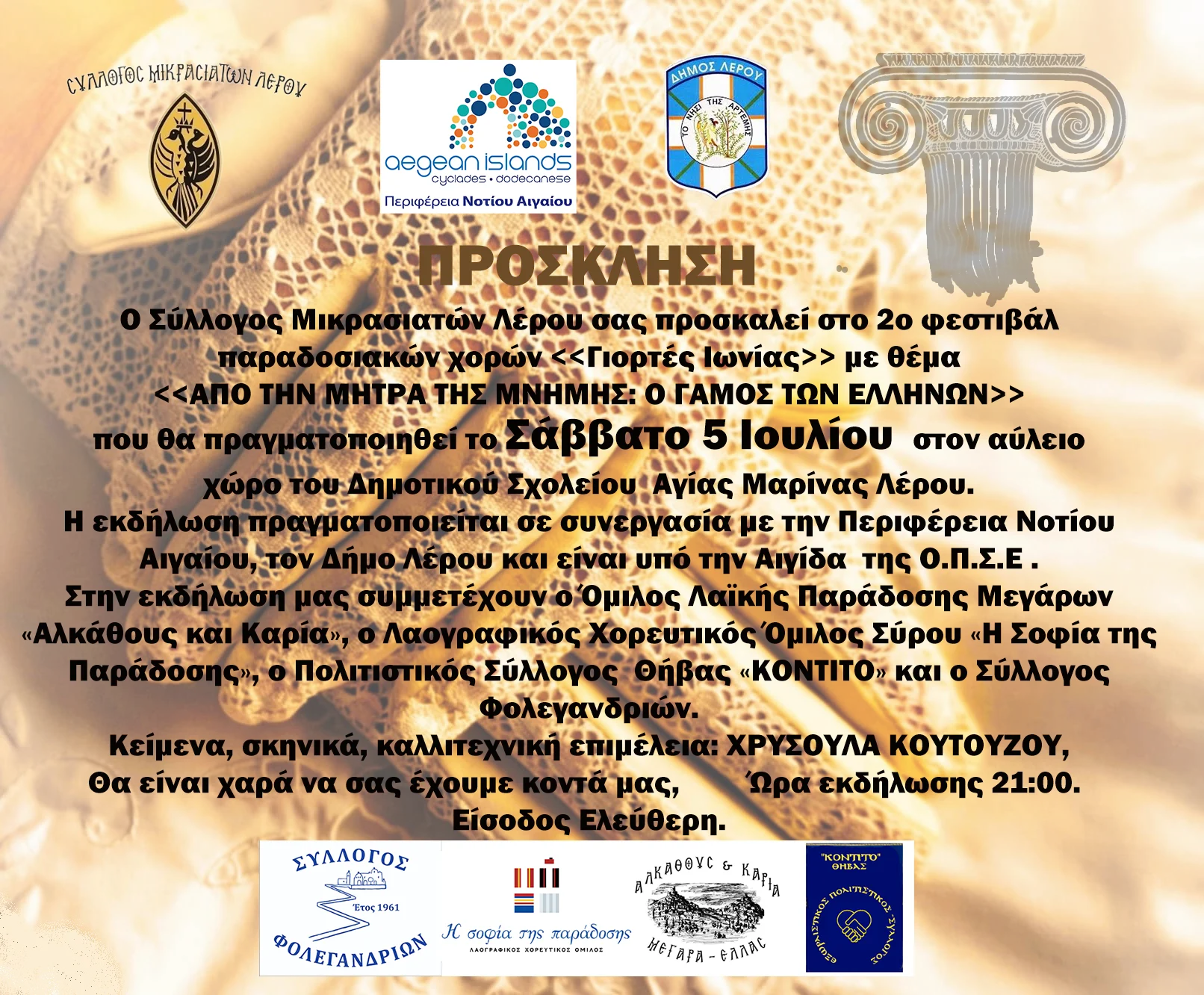 Η εκδήλωση πραγματοποιείται σε συνεργασία με την Περιφέρεια Νοτίου Αιγαίου, τον Δήμο Λέρου και είναι υπό την Αιγίδα της Ο.Π.Σ.Ε . Η εκδήλωση εντάσσεται στις εκδηλώσεις μνήμης και τιμής στους Μικρασιάτες προγόνους μας και περιλαμβάνει, κείμενα στα οποία παρουσιάζεται η λαογραφία της Ιωνίας της Καρίας καθώς και της Λερού.