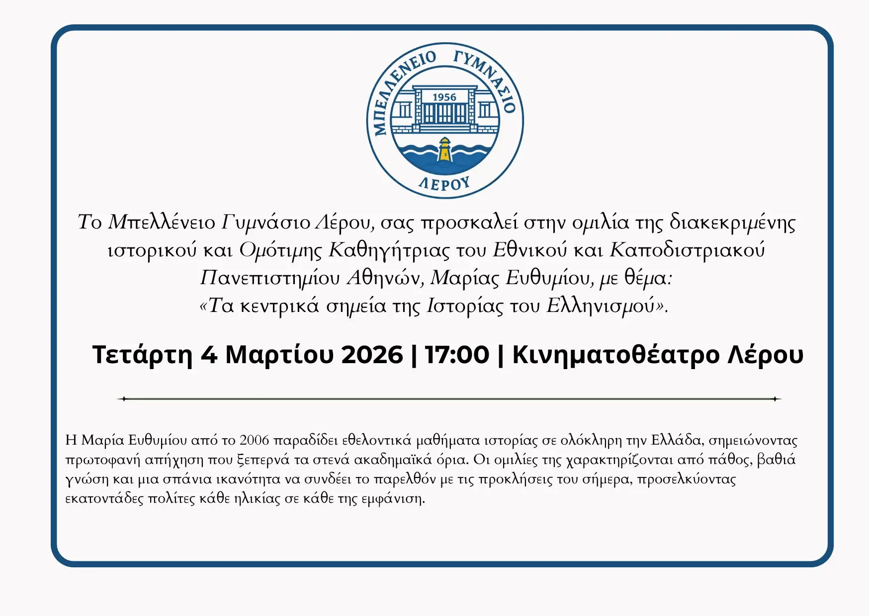 ΠΡΟΣΚΛΗΣΗ: Το Μπελλένειο Γυμνάσιο Λέρου, σας προσκαλεί στην ομιλία της διακεκριμένης ιστορικού και Ομότιμης Καθηγήτριας του Εθνικού και Καποδιστριακού Πανεπιστημίου Αθηνών, Μαρίας Ευθυμίου, με θέμα: