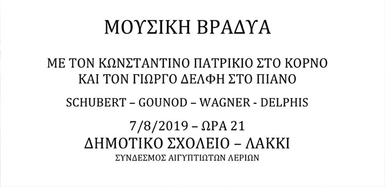 Ο Σύνδεσμος Αιγυπτιωτών Λερίων σας προσκαλεί στην μουσική βραδιά που διοργανώνει την Τετάρτη 7 Αυγούστου 2019 και ώρα 21:00 στο Δημοτικό Σχολείο Λακκιού.