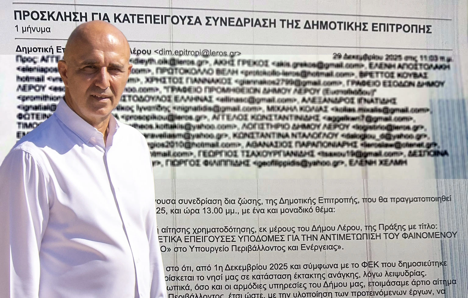 Σήμερα (σ.σ. 29/12/2025), στις 11:03 π.μ., έλαβα ηλεκτρονικό μήνυμα για κατεπείγουσα, δια ζώσης συνεδρίαση της Δημοτικής Επιτροπής, στις 13:00 με αντικείμενο τη λήψη απόφασης για χρηματοδότηση ύψους περίπου 10.000.000 ευρώ, κατόπιν δεύτερης (!) κήρυξης του νησιού μας σε κατάσταση έκτακτης ανάγκης από 1η Δεκεμβρίου λόγω λειψυδρίας.