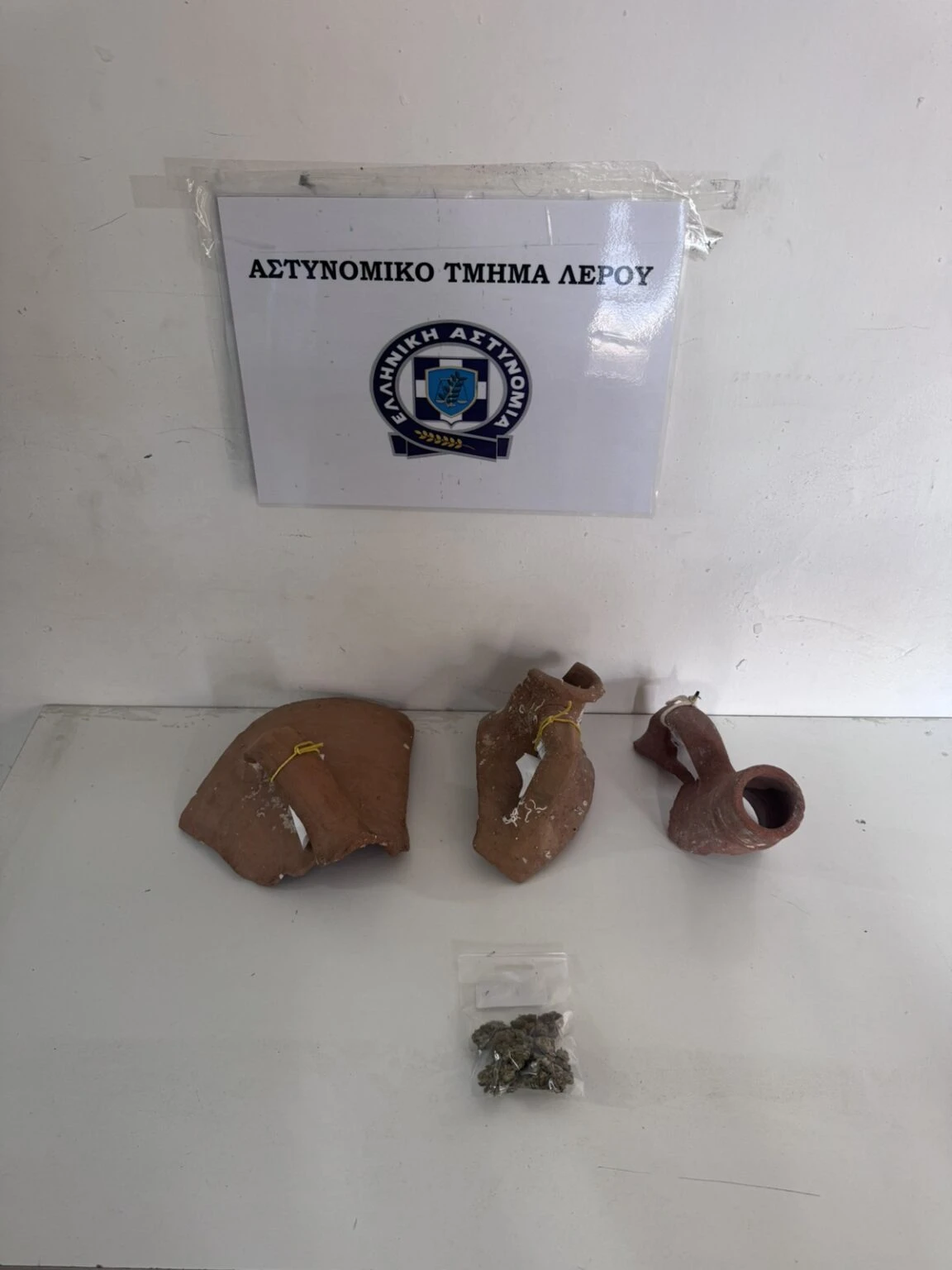 Την Πέμπτη 27-11-2025 το απόγευμα συνελήφθη στη Λέρο, από αστυνομικούς του Αστυνομικού Τμήματος Λέρου, 33χρονος αλλοδαπός, διότι στο πλαίσιο αστυνομικής έρευνας βρέθηκαν στην κατοχή του και κατασχέθηκαν -7,8- γραμμάρια ακατέργαστης κάνναβης, καθώς και τρία τμήματα πήλινων αγγείων – αμφορέων, η προέλευση των οποίων ερευνάται.