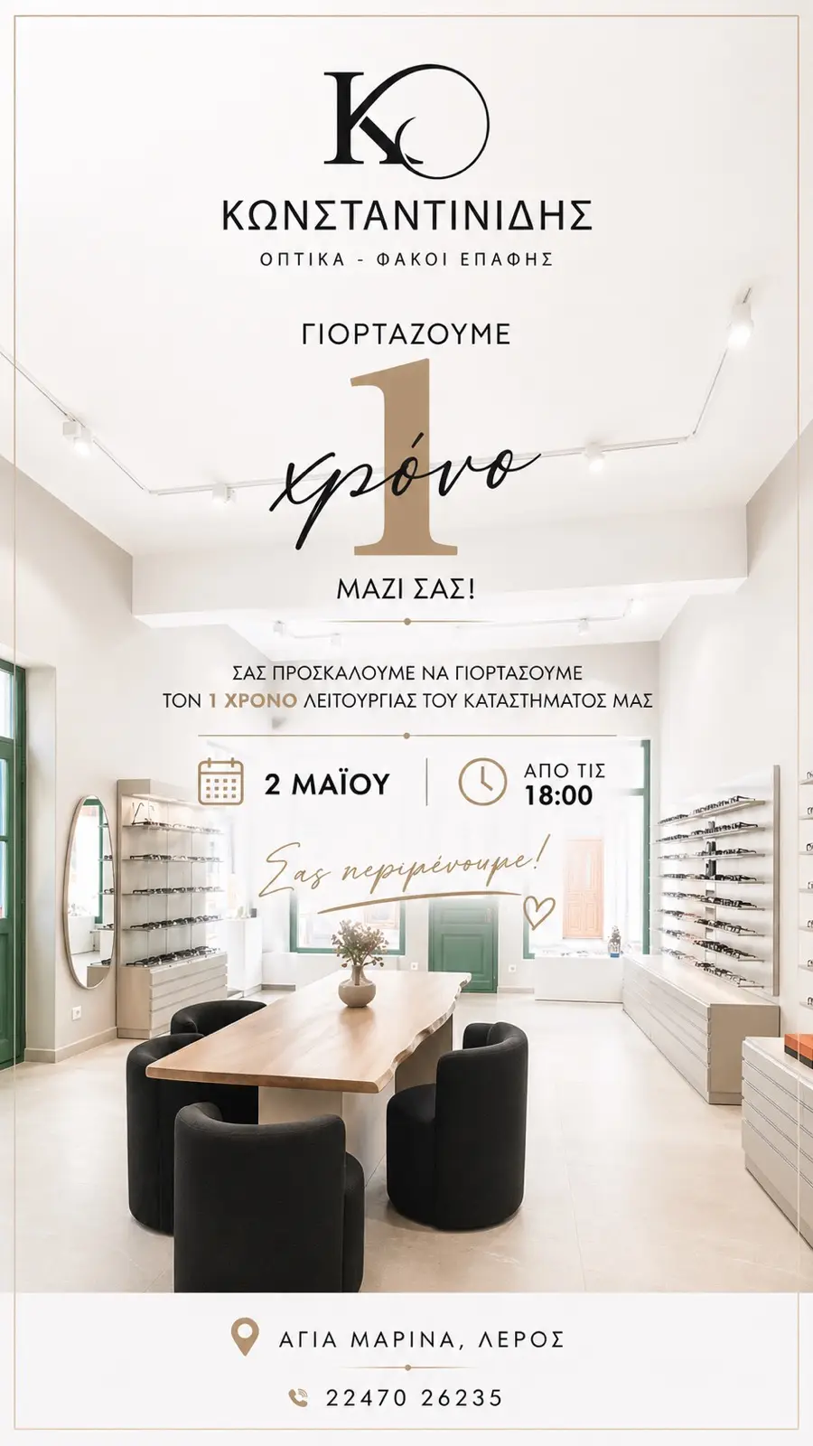 Τα Οπτικά Κωνσταντινίδης στην Αγία Μαρίνα Λέρου γιορτάζουν τον πρώτο χρόνο λειτουργίας τους και προσκαλούν φίλους, πελάτες και κατοίκους του νησιού να μοιραστούν μαζί τους αυτή την ξεχωριστή στιγμή.