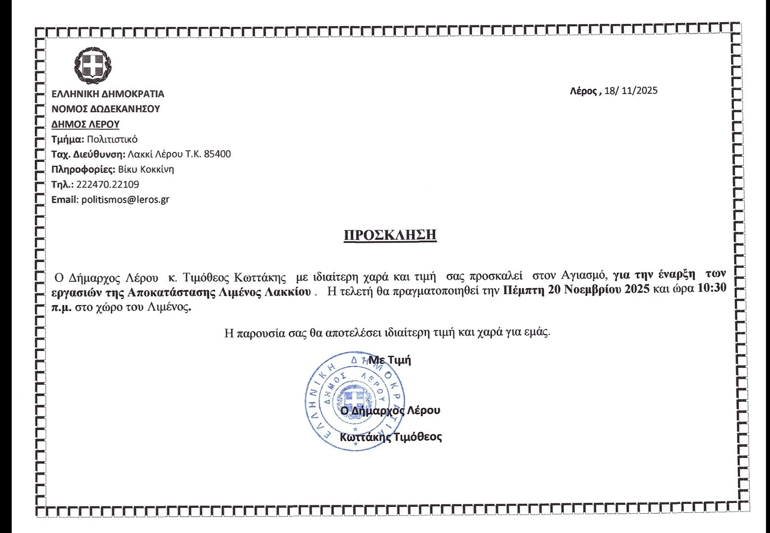 Ο Δήμαρχος Λέρου κ. Τιμόθεος Κωττάκης με ιδιαίτερη χαρά και τιμή σας προσκαλεί στον Αγιασμό, για την έναρξη των εργασιών της Αποκατάστασης Λιμένος Λακκίου.