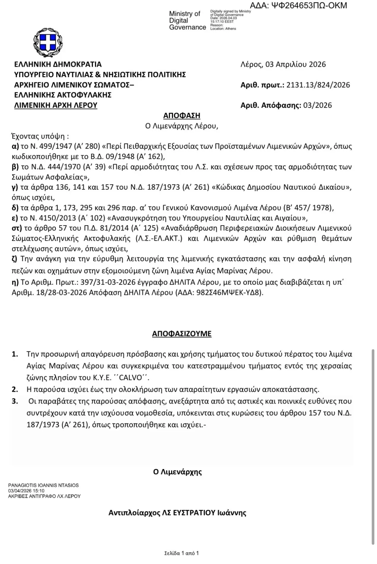 Παράλληλα, με την υπ’ αριθμ. 03/2026 απόφαση, που εκδόθηκε στις 3 Απριλίου 2026, αποφασίστηκε από το Λιμεναρχείο Λέρου η προσωρινή απαγόρευση πρόσβασης και χρήσης τμήματος του δυτικού πέρατος του λιμένα Αγίας Μαρίνας, και συγκεκριμένα του κατεστραμμένου τμήματος που βρίσκεται εντός της χερσαίας ζώνης, πλησίον του καταστήματος CALVO. Σύμφωνα με την απόφαση, το μέτρο θα παραμείνει σε ισχύ έως την ολοκλήρωση των απαραίτητων εργασιών αποκατάστασης.
