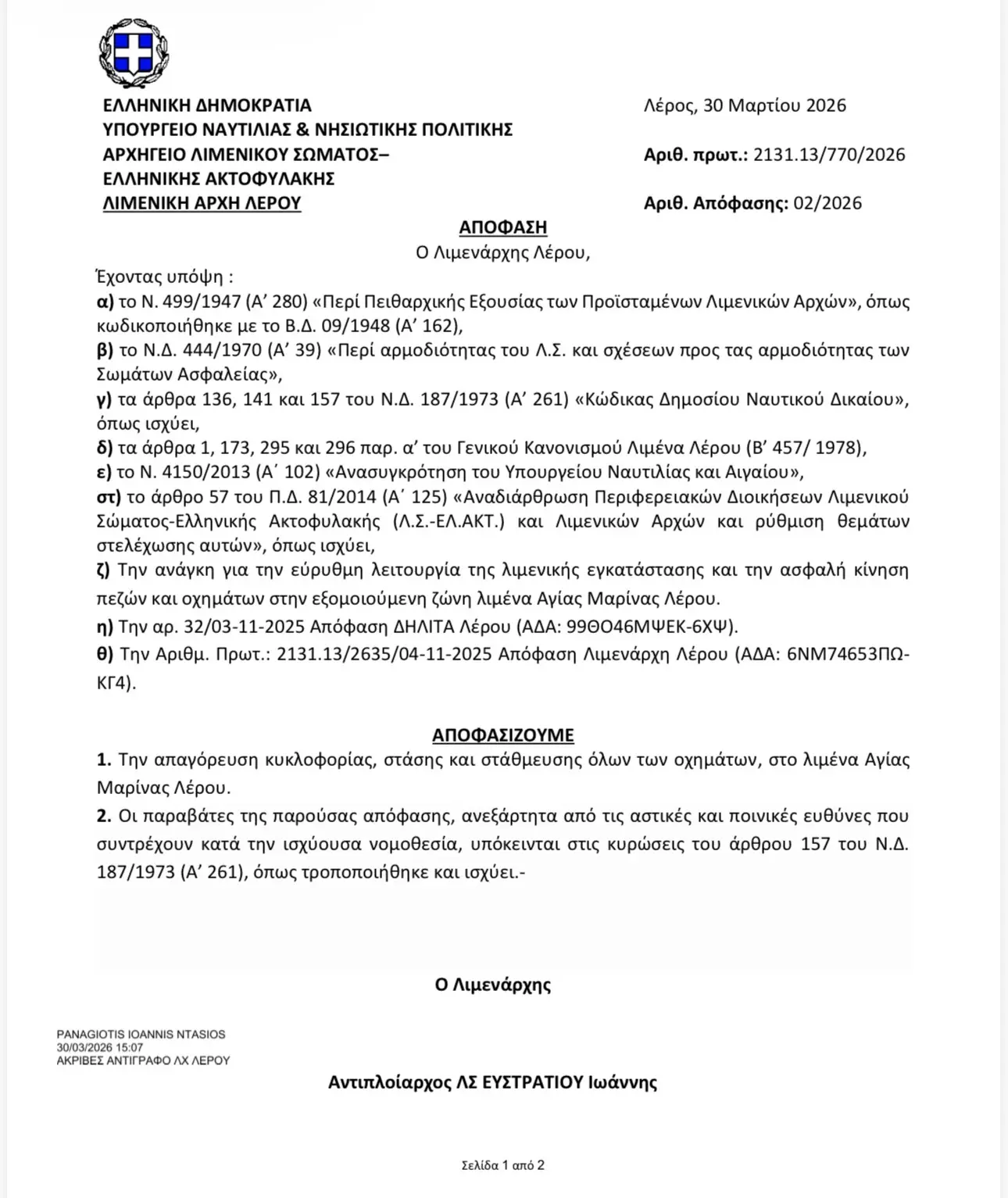 Ειδικότερα, με την υπ’ αριθμ. 02/2026 απόφαση, που εκδόθηκε στις 30 Μαρτίου 2026, απαγορεύεται η κυκλοφορία, η στάση και η στάθμευση όλων των οχημάτων στο λιμάνι της Αγίας Μαρίνας Λέρου.