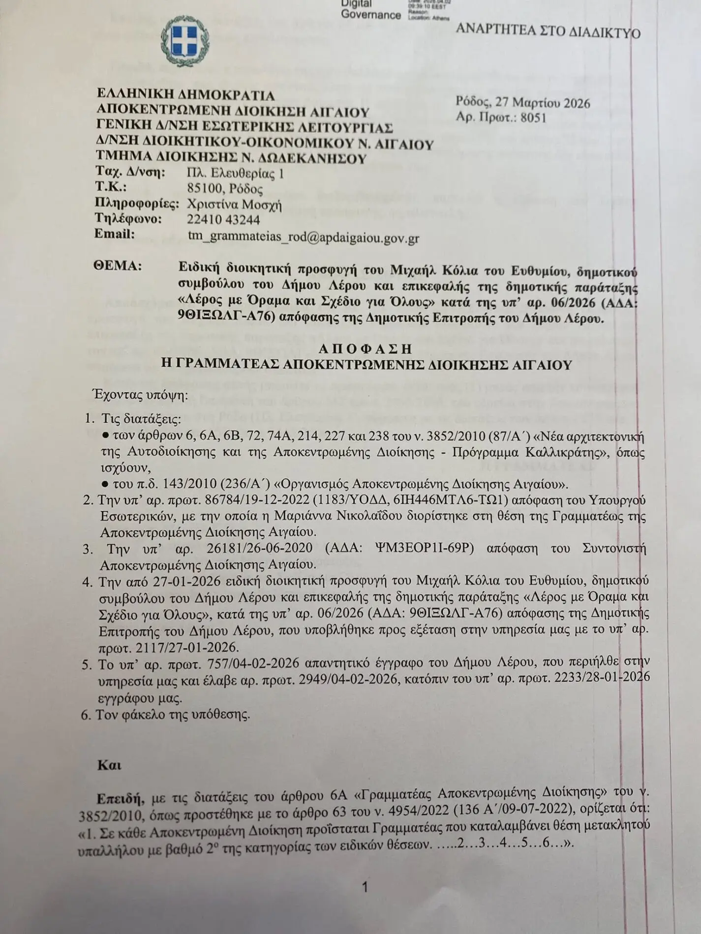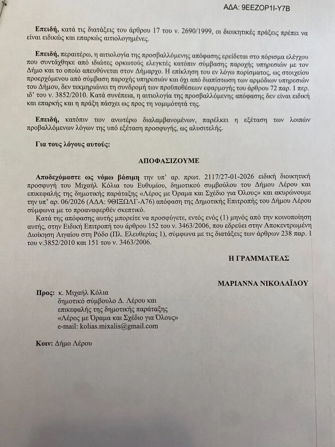 Υπενθυμίζουμε, λοιπόν, προς αποκατάσταση της αλήθειας, ότι η απόφαση της 20-01-2026, με την οποία, κατόπιν πρότασης του ως Προέδρου της Δημοτικής Επιτροπής, ανατέθηκε σε εξωτερικό δικηγόρο, κ. Βασίλειο Καπερνάρο, η κατάθεση μηνυτήριας αναφοράς και η εκπροσώπηση του Δήμου, ακυρώθηκε πανηγυρικά με την υπ’ αριθμ. πρωτ. 8051/27-03-2026 απόφαση της Αποκεντρωμένης Διοίκησης Αιγαίου, μετά την ειδική διοικητική προσφυγή που κατέθεσα στις 27-01-2026.