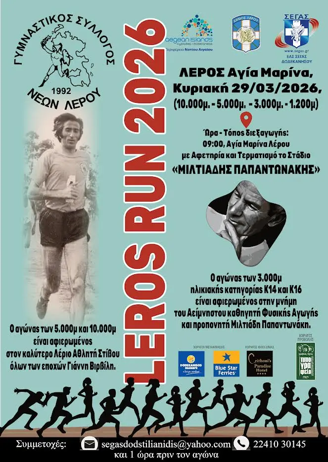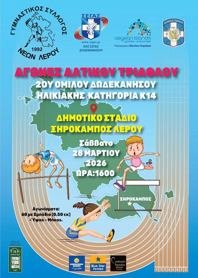 ΠΡΟΣΚΛΗΣΗ – Ο Γυμναστικός Σύλλογος Νέων Λέρου σας προσκαλεί να παρακολουθήσετε τις αθλητικές εκδηλώσεις, που διοργανώνει σε συνεργασία με την Ε.Α.Σ. Σ.Ε.Γ.Α.Σ. Δωδεκανήσου, τον Δήμο Λέρου και την Περιφέρεια Νοτίου Αιγαίου (ΠΝΑΙ), το Σάββατο στις 28-03-2026 στο στάδιο του Ξηροκάμπου και ώρα 15:30 μ.μ. και την Κυριακή στις 29-03-2026 στο γήπεδο της Αγίας Μαρίνας «Μιλτιάδης Παπαντωνάκης» ώρα 09:00 π.μ..