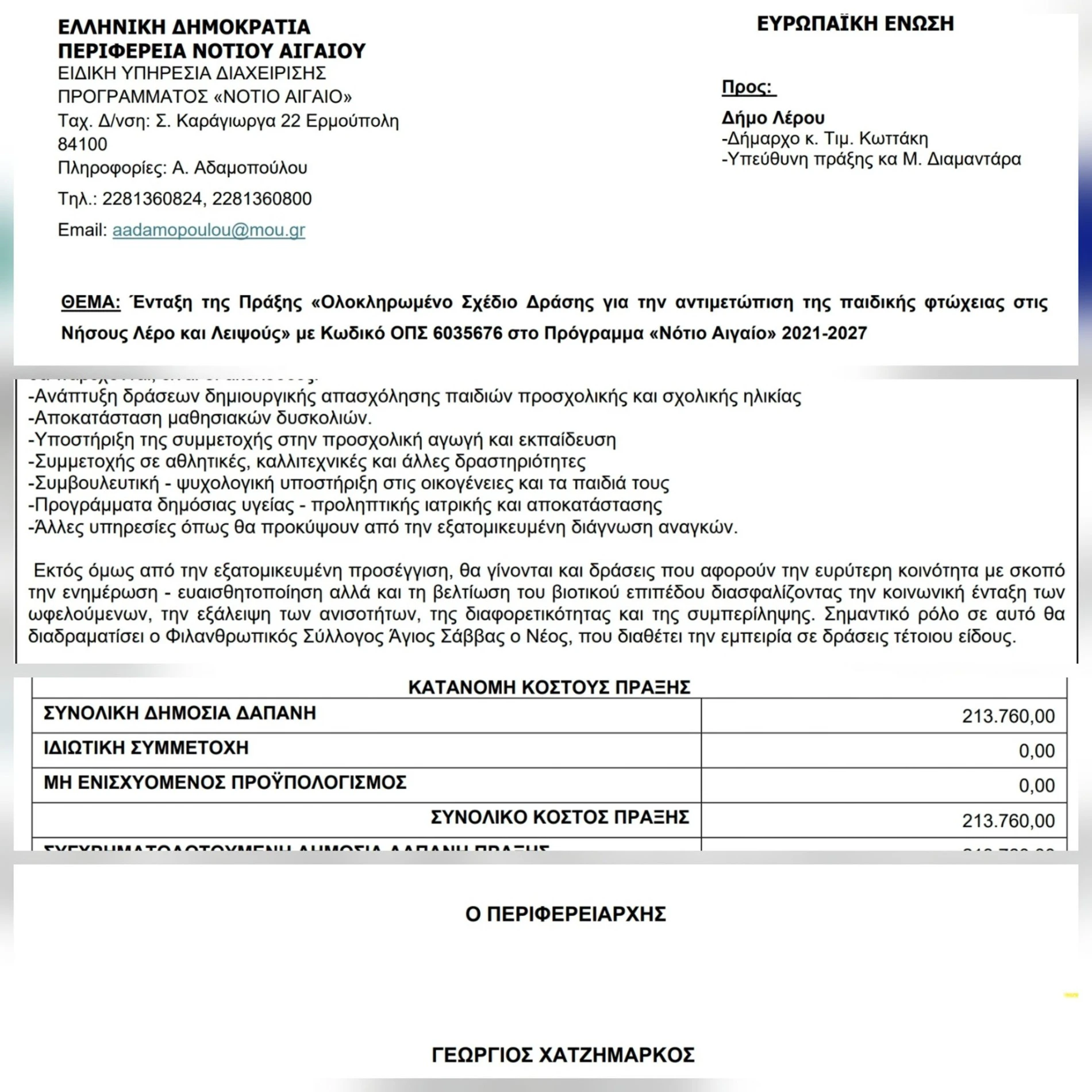 Εντάχθηκε με απόφαση του Περιφερειάρχη Ν. Αιγαίου στο Επιχειρησιακό Πρόγραμμα «Νότιο Αιγαίο 2021–2027» η Πράξη «Ολοκληρωμένο Σχέδιο Δράσης για την Αντιμετώπιση της Παιδικής Φτώχειας στις Νήσους Λέρο και Λειψούς», η οποία υποβλήθηκε από κοινού από τον Δήμο Λέρου και τον Δήμο Λειψών.