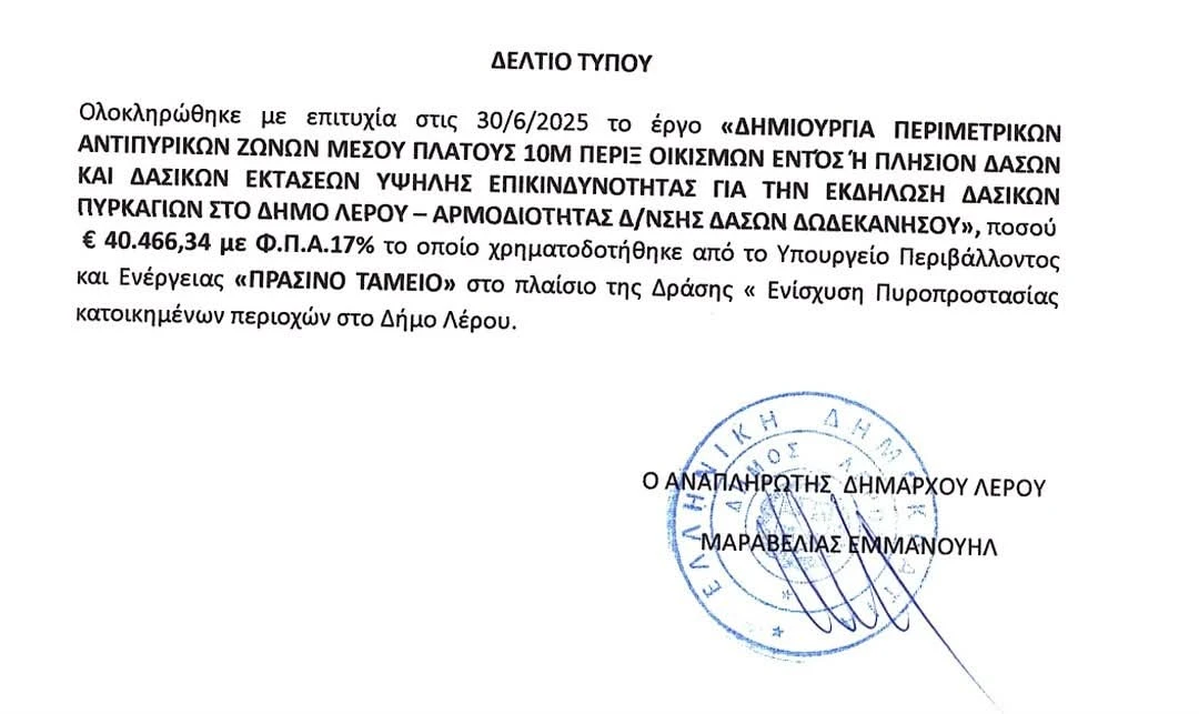 Ολοκληρώθηκε με επιτυχία στις 30 Ιουνίου 2025 το έργο «Δημιουργία περιμετρικών αντιπυρικών ζωνών μέσου πλάτους 10 μέτρων πέριξ οικισμών εντός ή πλησίον δασών και δασικών εκτάσεων υψηλής επικινδυνότητας για την εκδήλωση δασικών πυρκαγιών στο Δήμο Λέρου», αρμοδιότητας της Διεύθυνσης Δασών Δωδεκανήσου.