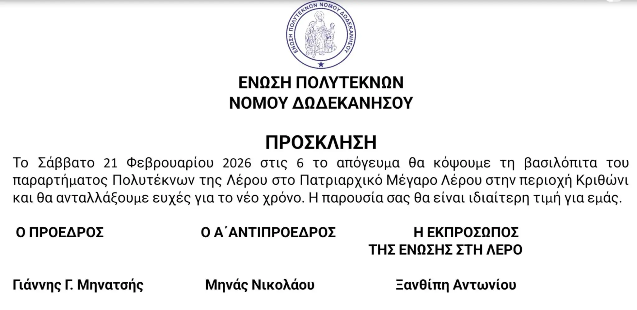 ΠΡΟΣΚΛΗΣΗ – Το Σάββατο 21 Φεβρουαρίου 2026 στις 6 το απόγευμα θα κόψουμε τη βασιλόπιτα του παραρτήματος Πολυτέκνων της Λέρου, στο Πατριαρχικό Μέγαρο Λέρου στην περιοχή Κριθώνι και θα ανταλλάξουμε ευχές για το νέο χρόνο.