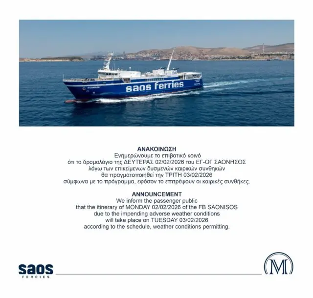 We inform the passenger public that the itinerary of MONDAY 02/02/2026 of the FB SAONISOS due to the impending adverse weather conditions will take place on TUESDAY 03/02/2026 according to the schedule, weather conditions permitting.